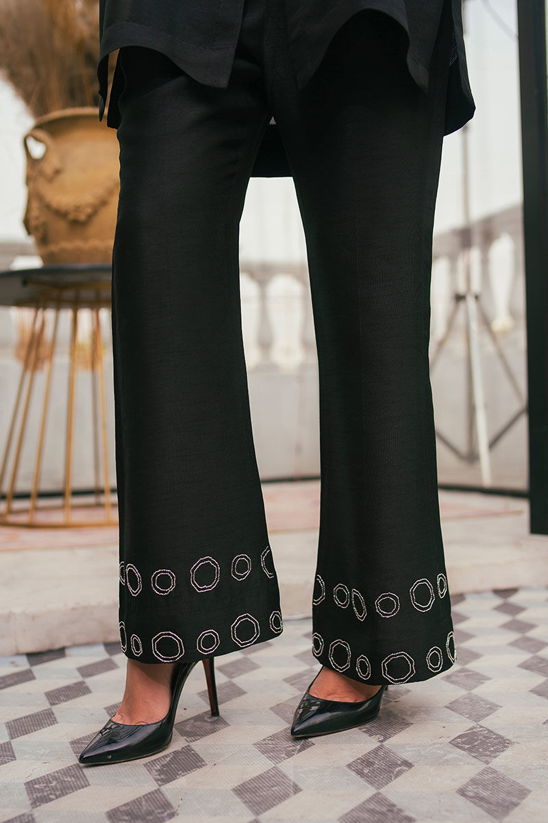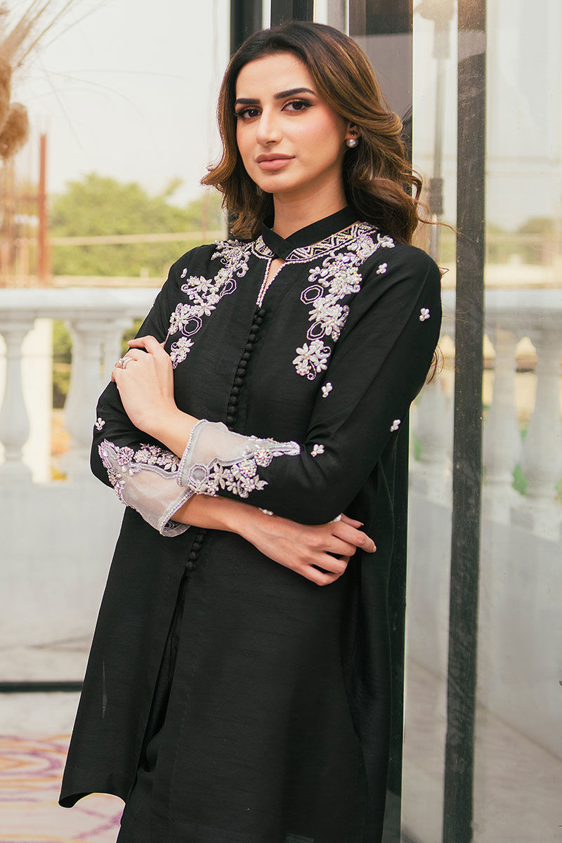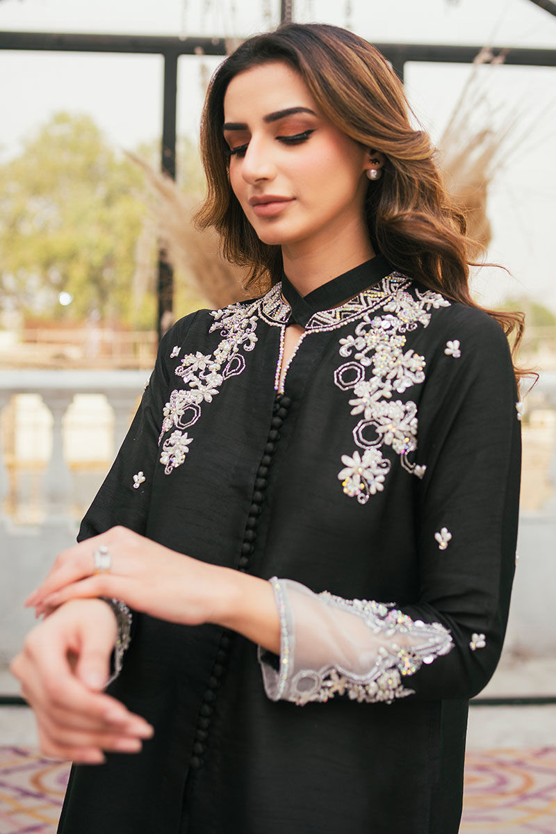 Drape yourself in our signature outfit “Narah” a pure embodiment of true allure and opulence. The beauty of this ensemble is enhanced with pearls and hand-embellished motifs along with stone work on the neckline collar and shirt front. An opulent outfit with a signature cut for a perfect look.