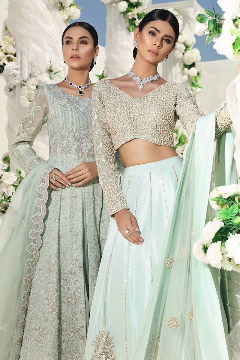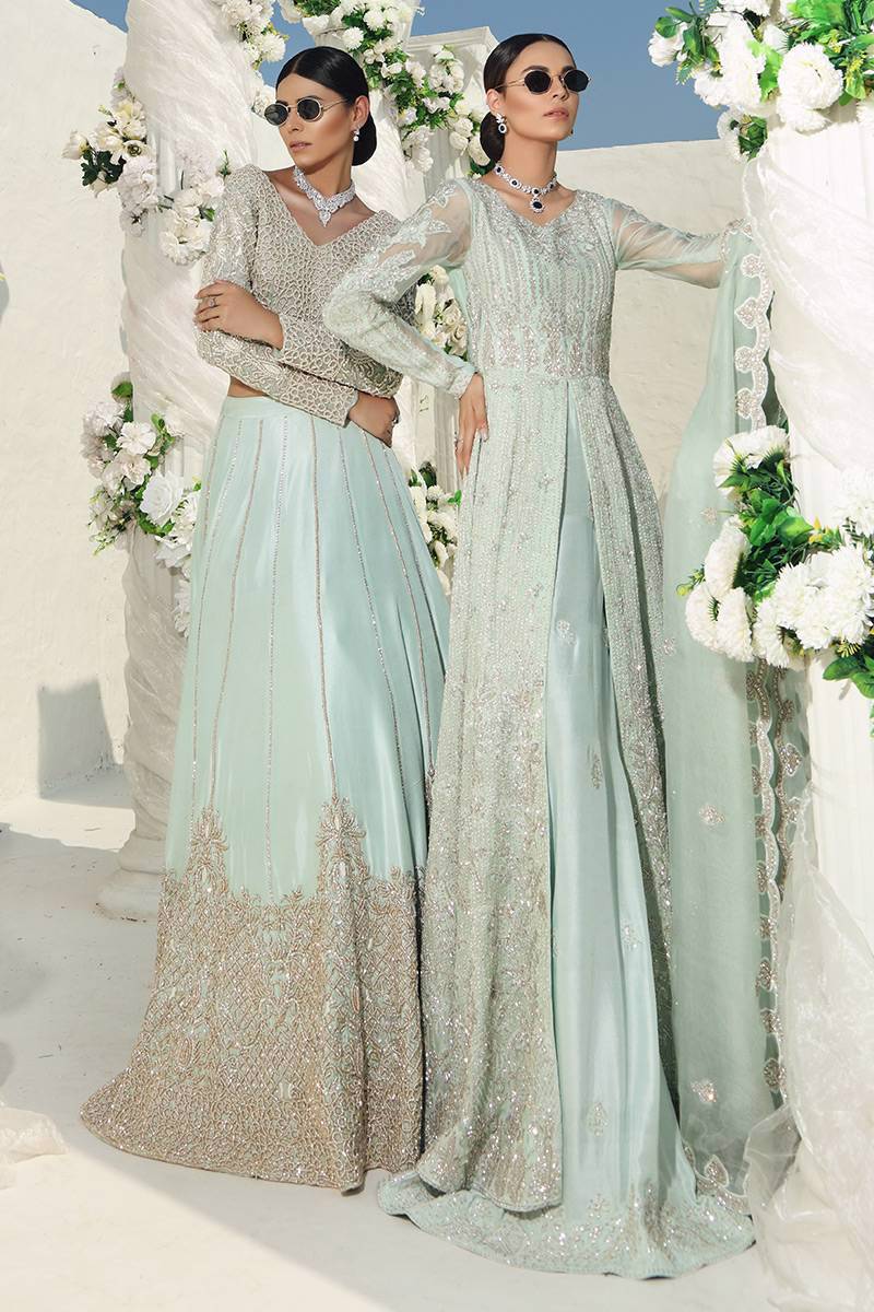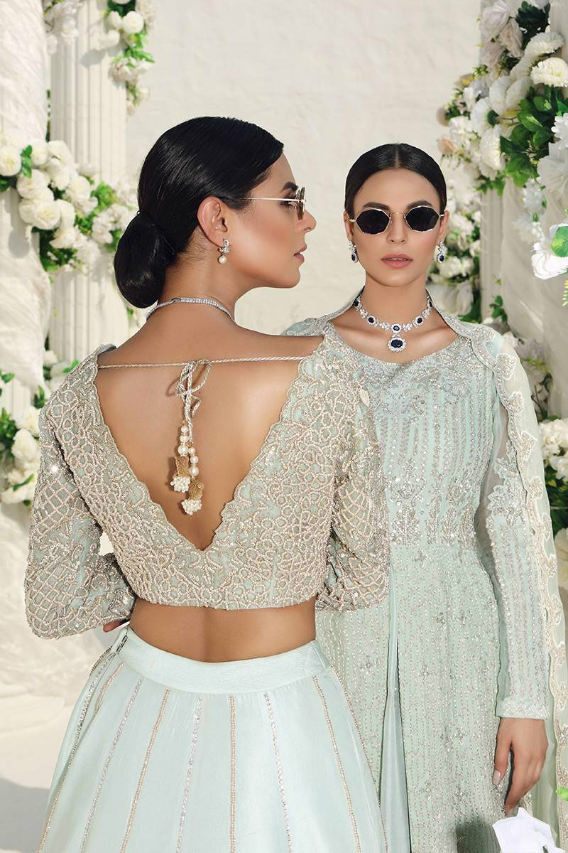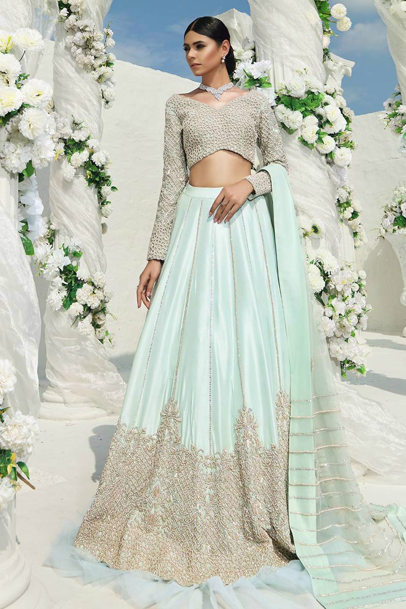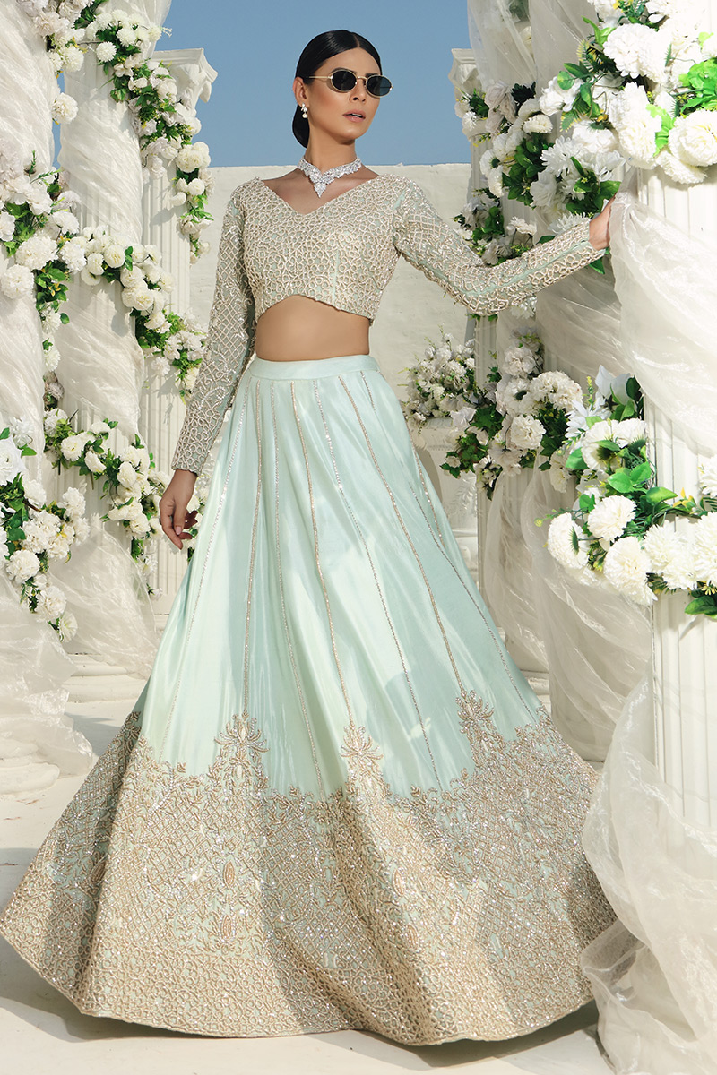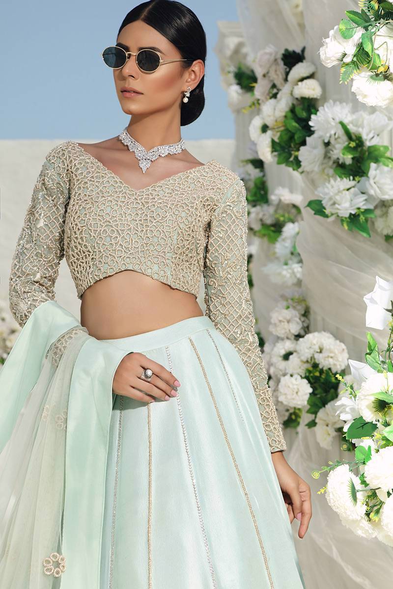 An organza net blouse hand embellished with pearls and nakshi is paired with a raw silk lengha with hand embellishments of pearl zari and cutdana. It comes with a worked net organza dupatta with hand embellished pearls and zari.