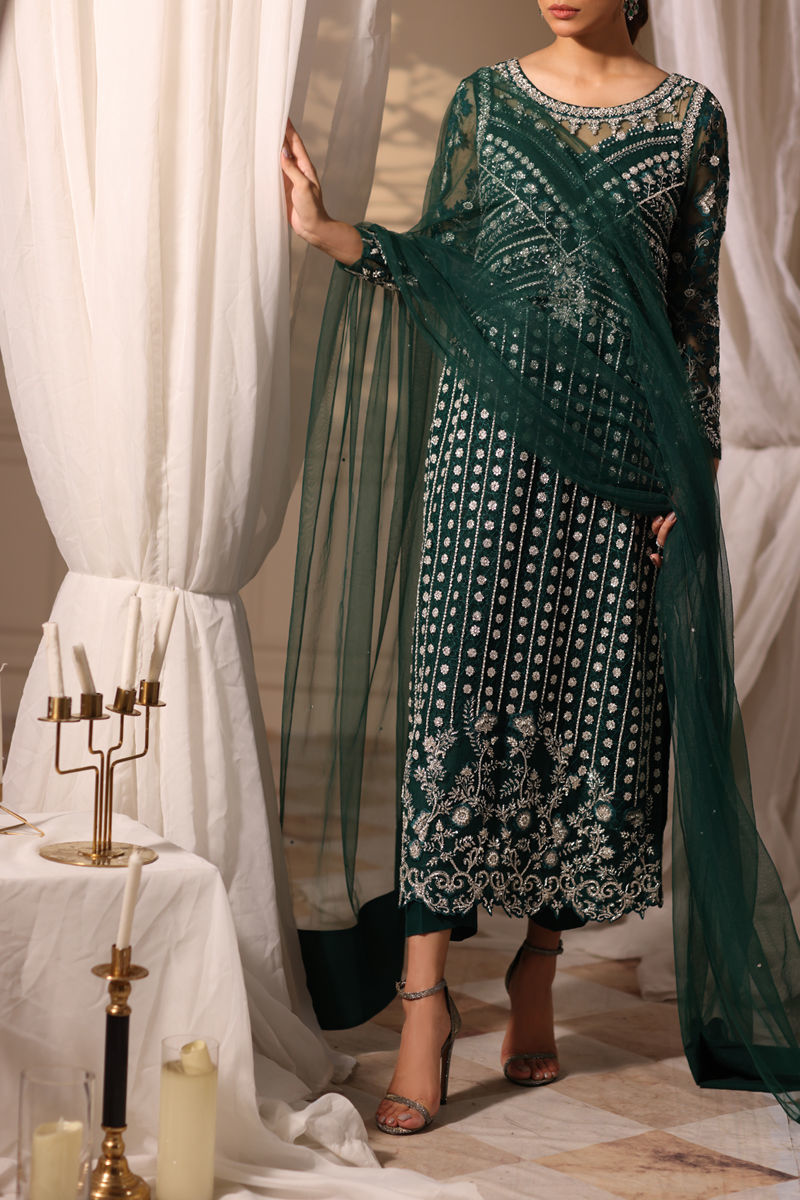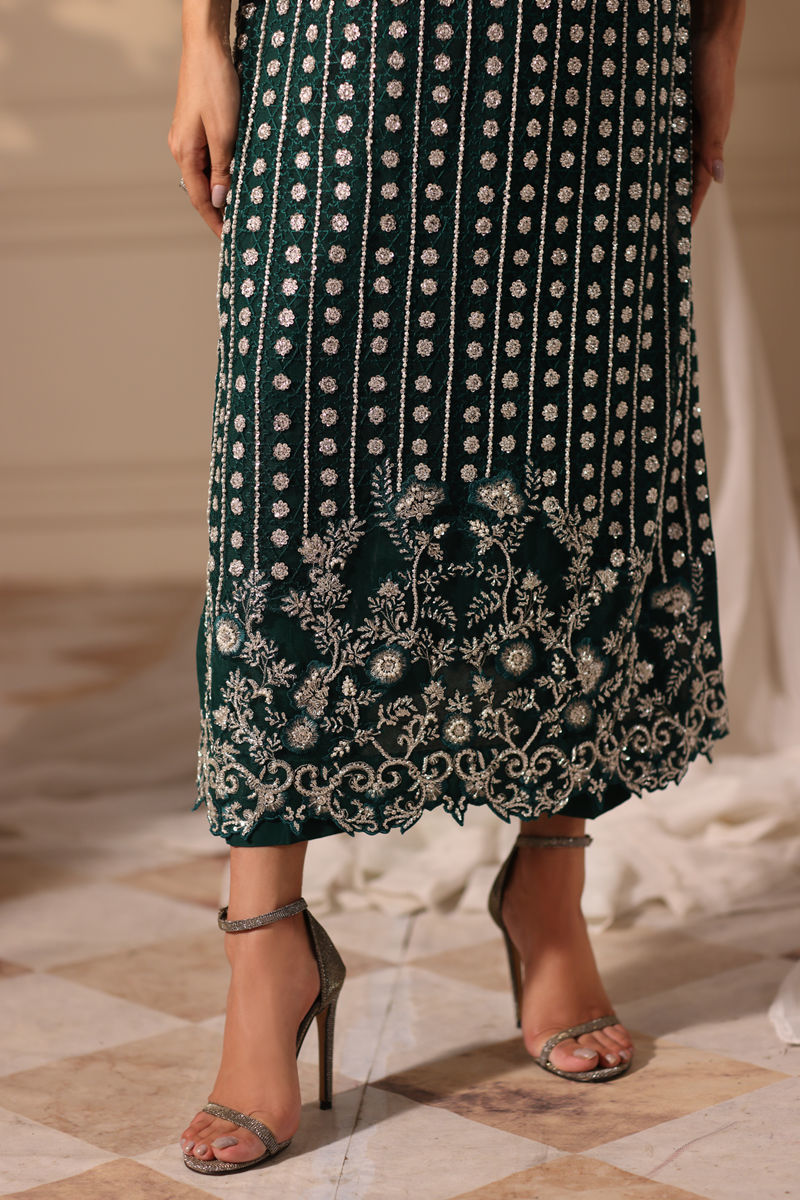An elegant ensemble featuring a long net shirt adorned with intricate hand embroidery and shimmering Swarovski crystals across the front, back, and sleeves. The shirt is further embellished with hand-applied Swarovski crystals, dabka, pearls, and naqshi, adding a touch of luxury. Paired with plain Korean silk pants and a net dupatta adorned with delicate chanwork, this outfit exudes timeless grace and sophistication.