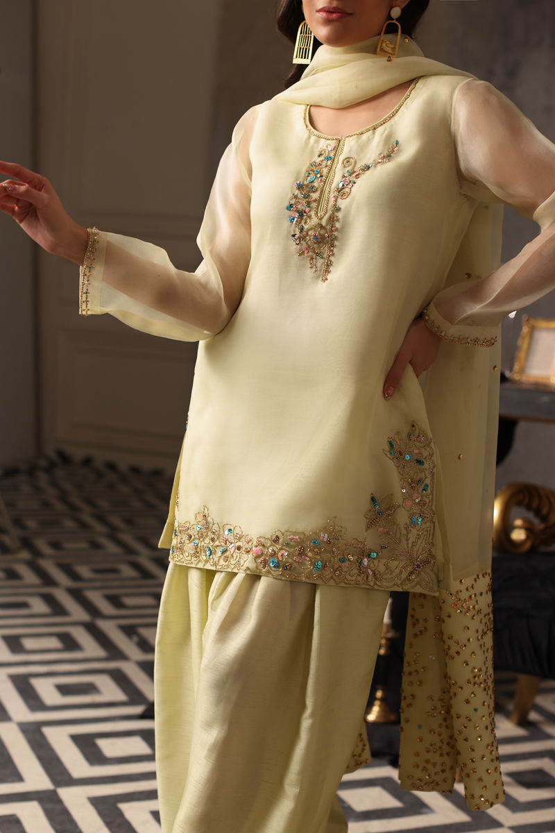 Immerse yourself in elegance with this dreamy organza shirt with silk lining, beautifully enhanced by delicate handwork on the neckline, hem, and sleeves. The hand embellished keyhole design adds a charming detail, while the outfit’s floral accents and sequined raw silk shalwar create a timelessly graceful look. A dupatta with gold sequins on the pallu adds a subtle sparkle, enhancing the ensemble’s ethereal charm.