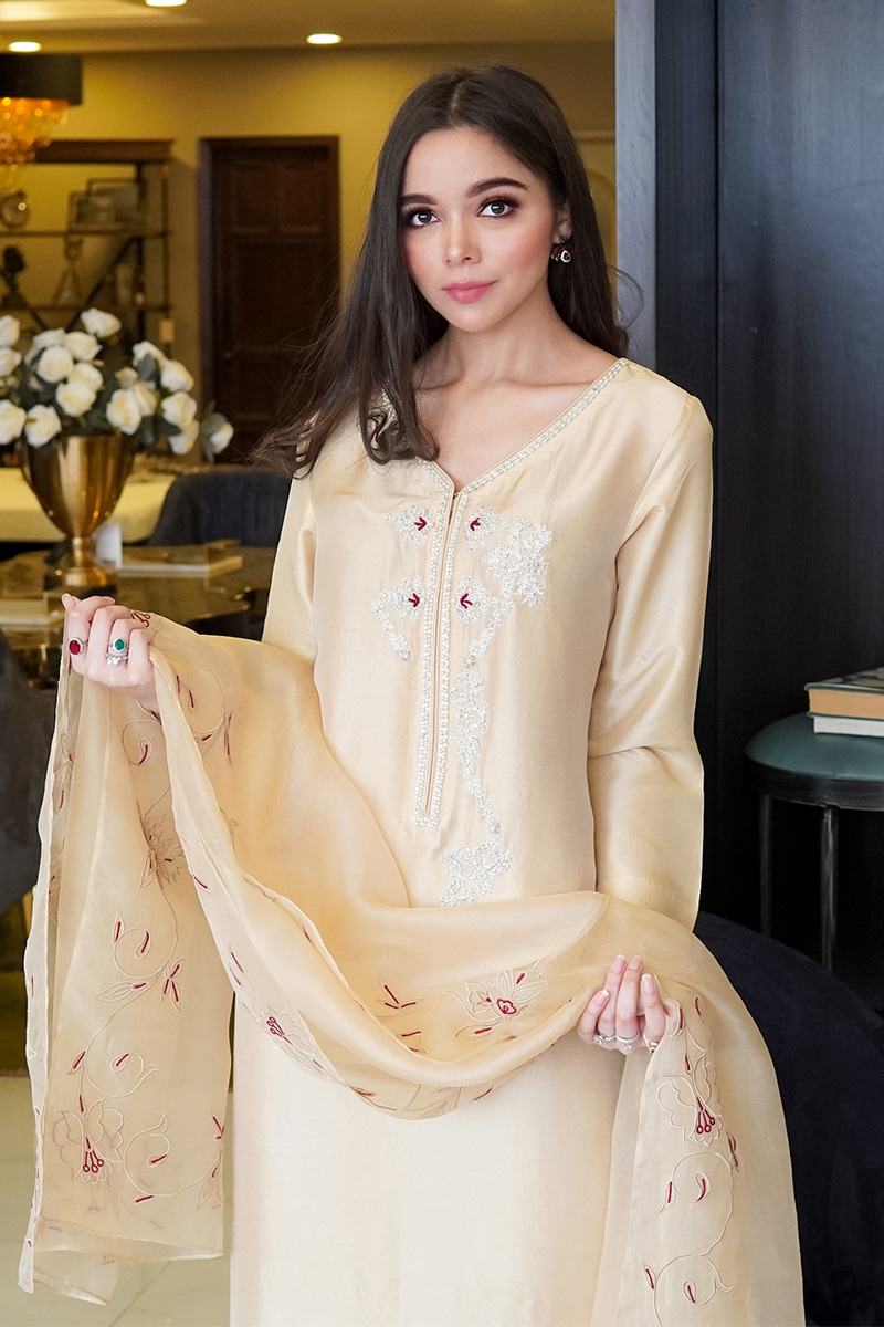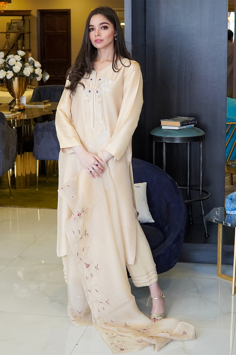 Our korean raw silk shirt in eye-catching color of gold is hand embellished with pearls. Thread beckti on korean raw silk shalwar with pearl finish completes the look.