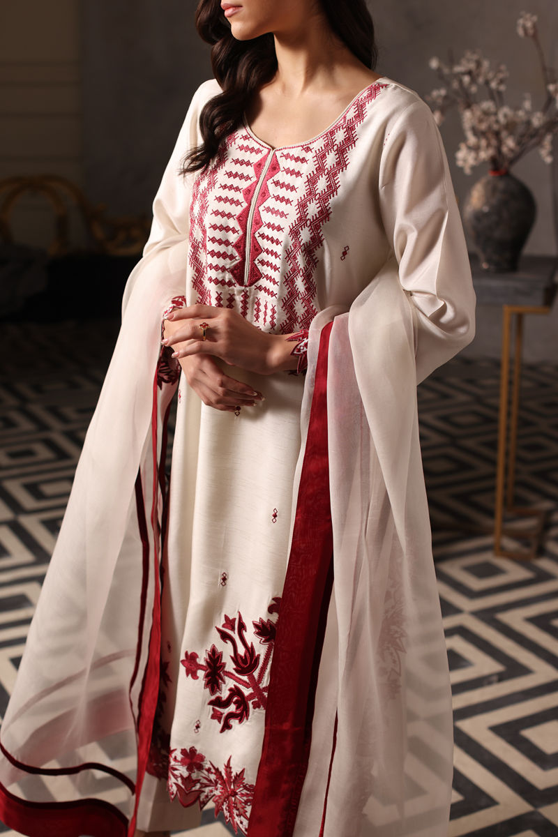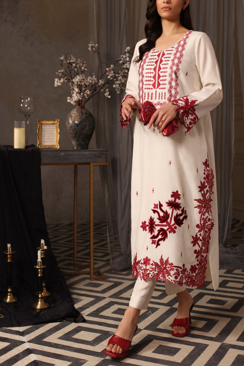Color: Ivory & Maroon Fabric: Korean raw silk Work Details: Embroidered & Velvet Applique