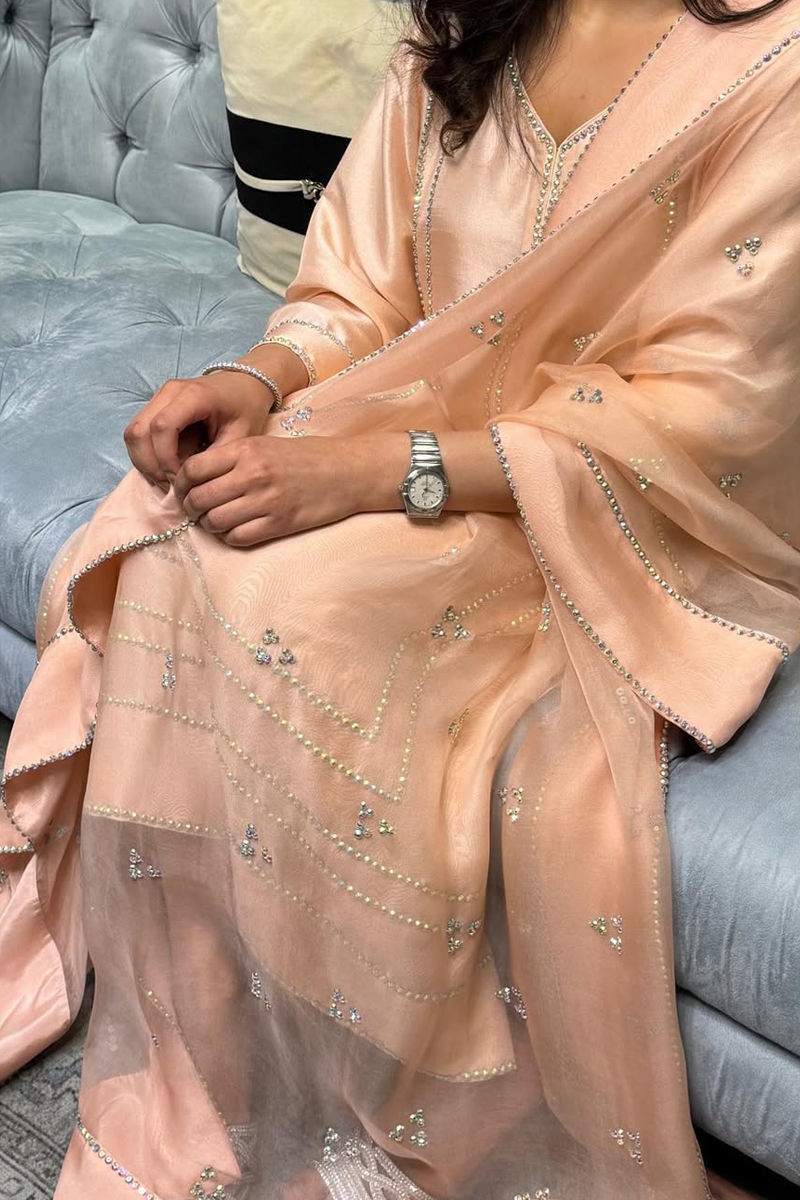 Elegance personified! This peach Korean raw silk shirt is a true masterpiece, adorned with a lavish display of Swarovski crystals that catch every eye. It's thoughtfully paired with culottes for comfort and style. Completing the ensemble is a pure organza hand worked dupatta, adding an extra layer of sophistication to this timeless outfit.