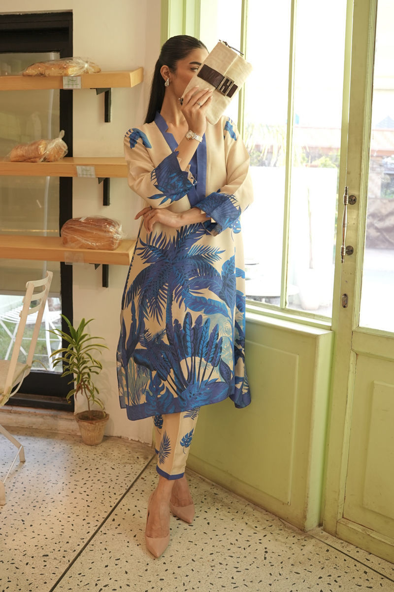 A symphony of silk and digital finesse, where style meets sophistication. Elegance unfolds in a canvas for digital artistry in blue and ivory. The shirt seamlessly merges style, complemented by pants.