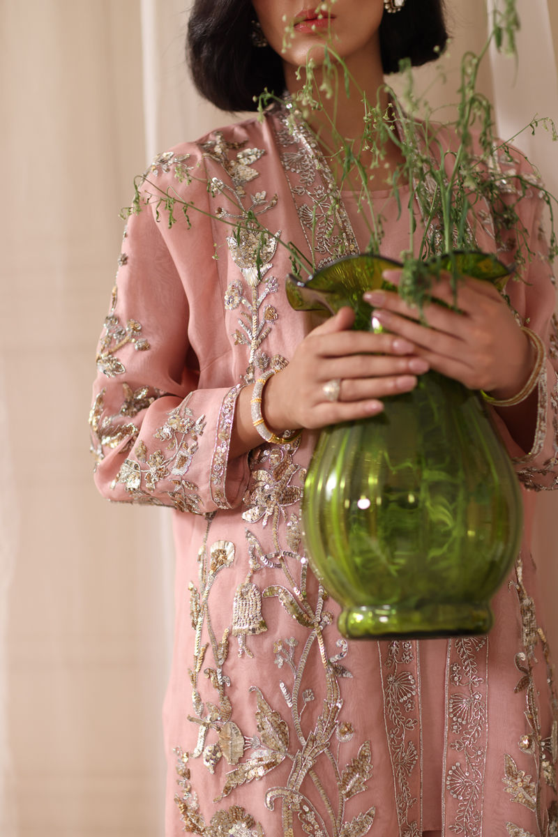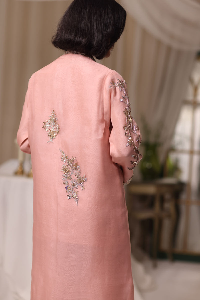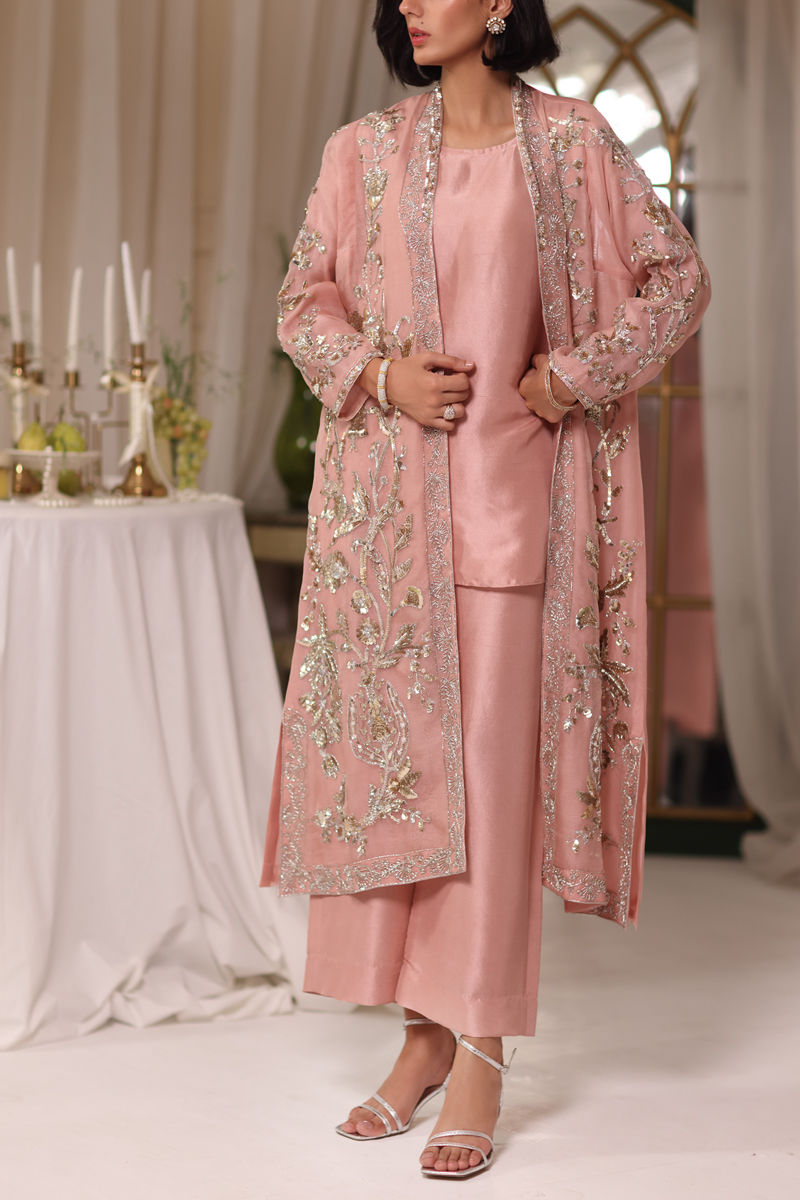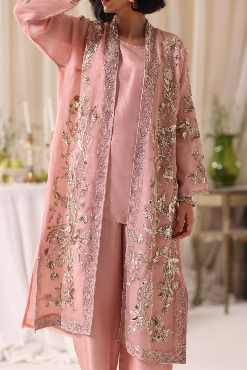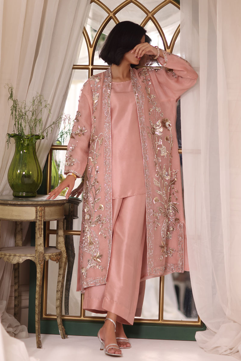 A dreamy vision in pink, this organza coat shimmers with delicate sequins, mukesh, and tilla work that graces the front and sleeves, while a dainty motif adorns the back like a whisper of artistry. Paired with a pure raw silk slip and culotte pants, the ensemble flows with understated luxury, where every detail is woven with grace and romance.