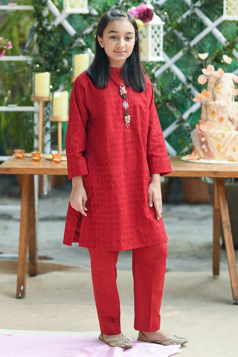 Red cotton chikankari shirt with an intricate embellished neckline paired with cotton pants.