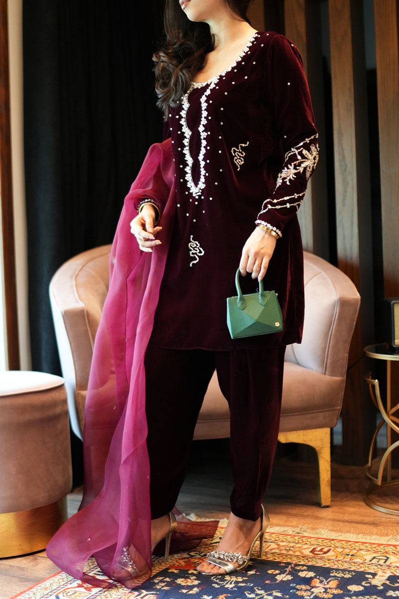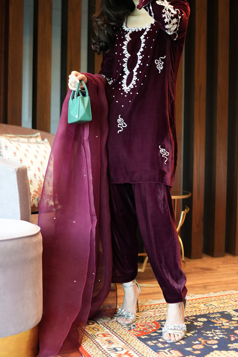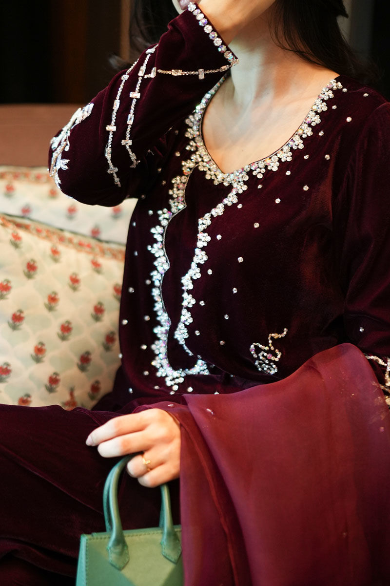 Color: Maroon Fabric: Velvet Work Details: Swavroski and Stones