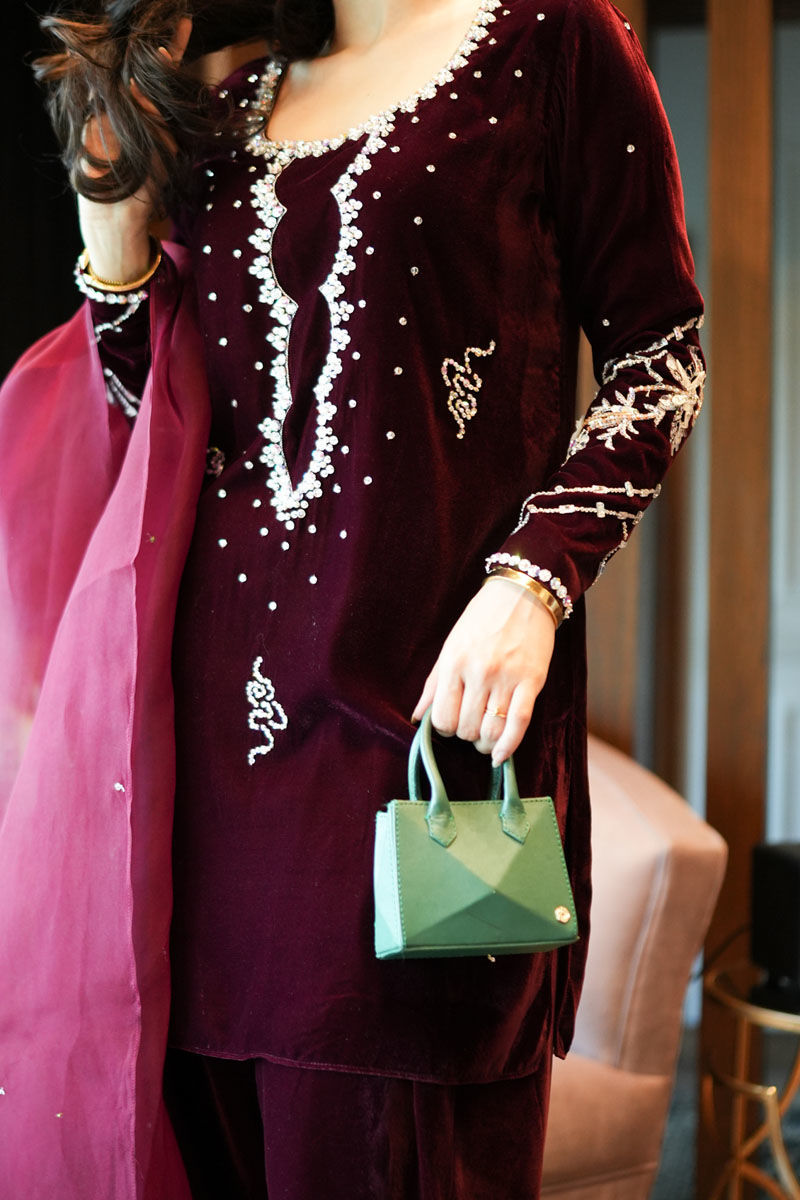 It’s pure understated luxury, Reeja - where the allure of maroon velvet meets the sparkle of Swarovski and stones. Effortlessly graceful with its sleek skinny shalwar silhouette and soft organza dupatta, it embodies festive sophistication.