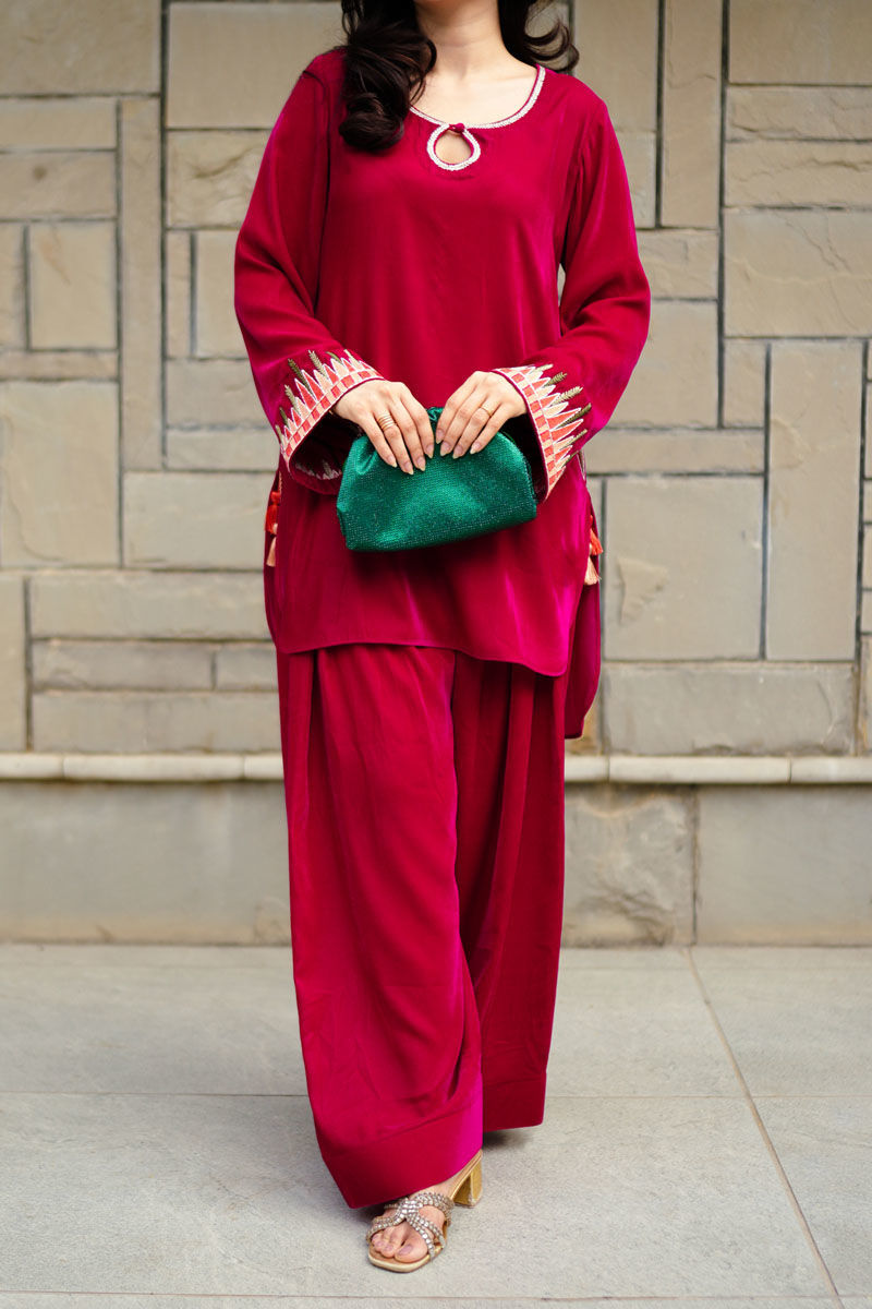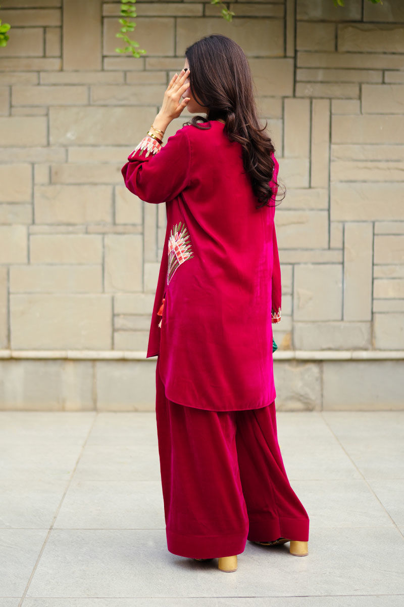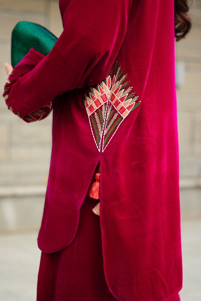 Reshna - beautiful, and irresistibly chic. Drenched in shocking pink velvet, it features intricate embroidery on the neckline and sleeves, finished with playful tassels for a touch of festive flair.