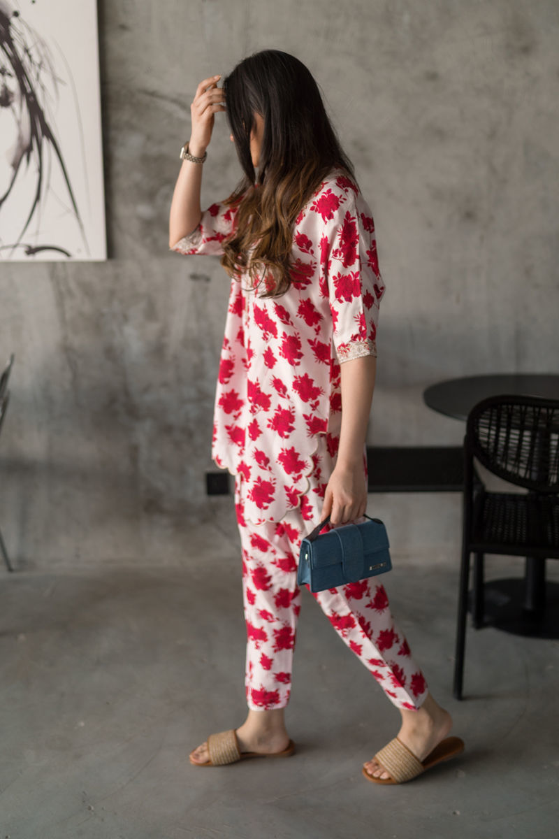 Flowy loose one-piece cut (without a defined armhole) shirt in red & white, paired with a sleek skinny shalwar for that effortless vibe. Free-size comfort meets soft chic.