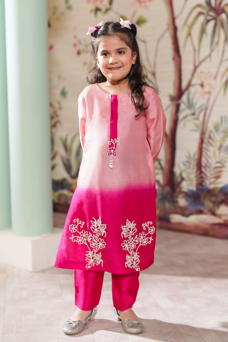 The shirt has a beautiful gradient effect, transitioning from one shade of pink to another. It is adorned with hand-embellished Swarovski crystals on the hem and neckline, adding a touch of sparkle and luxury. The sleeves feature scallops, which provide a unique and stylish element to the design. The dupatta, you've selected an ivory organza fabric. It is embellished with silk applique all around, creating a delicate and intricate design. The dupatta is finished with Swarovski crystals, adding a luxurious and eye-catching detail.