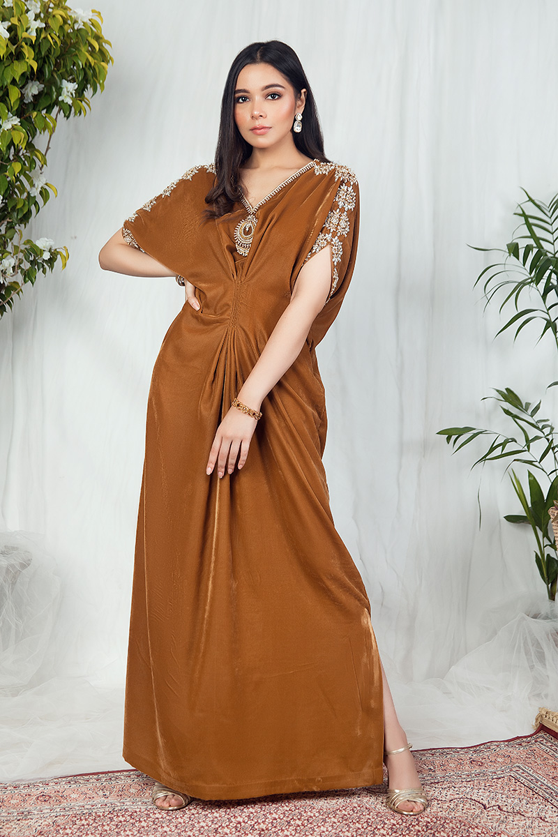 Our beautiful velvet kaftan with pearl and zari embellishments on neckline and sleeves. Beautified with slits along the sides.