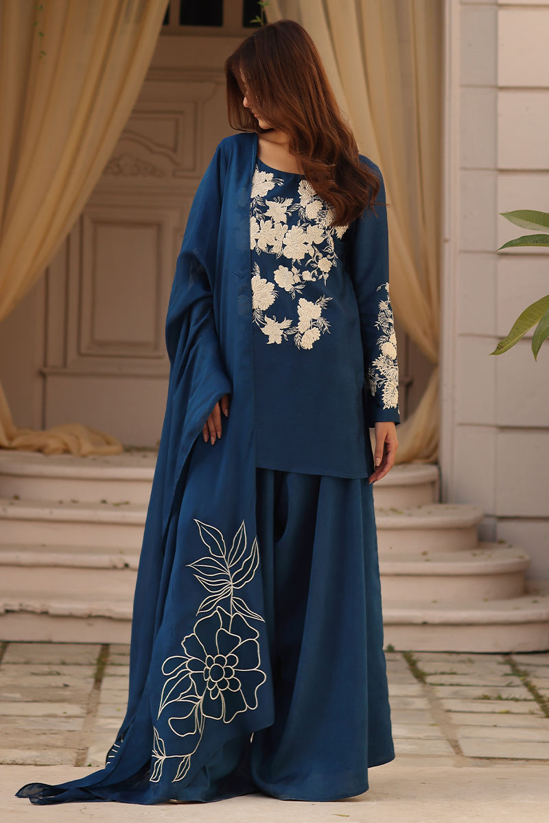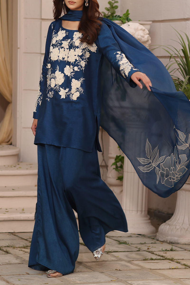 Make a bold festive statement in this electric blue ensemble, featuring a finely hand-embroidered raw silk shirt paired with a graceful raw silk flare pant. The look is elevated with an embroidered silk dupatta, beautifully finished with delicate organza appliqué work for added texture and depth. Hand embroidery adorns the front and sleeves, showcasing artisanal craftsmanship - perfect for contemporary celebrations with a luxe touch. This shirt length is 29-inch and pants length is 41-inch