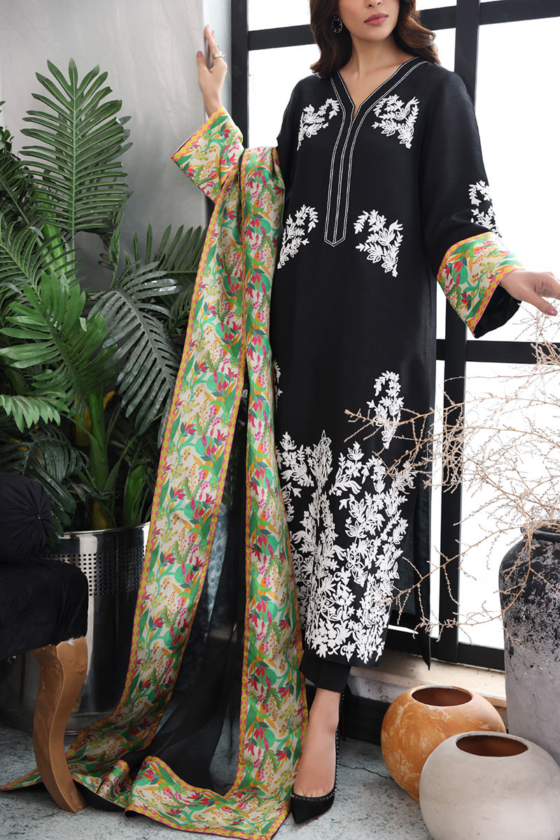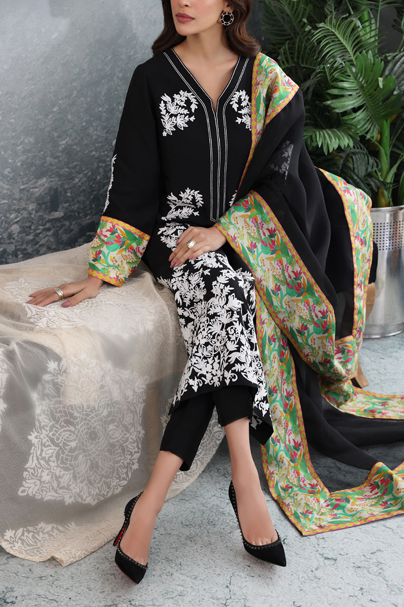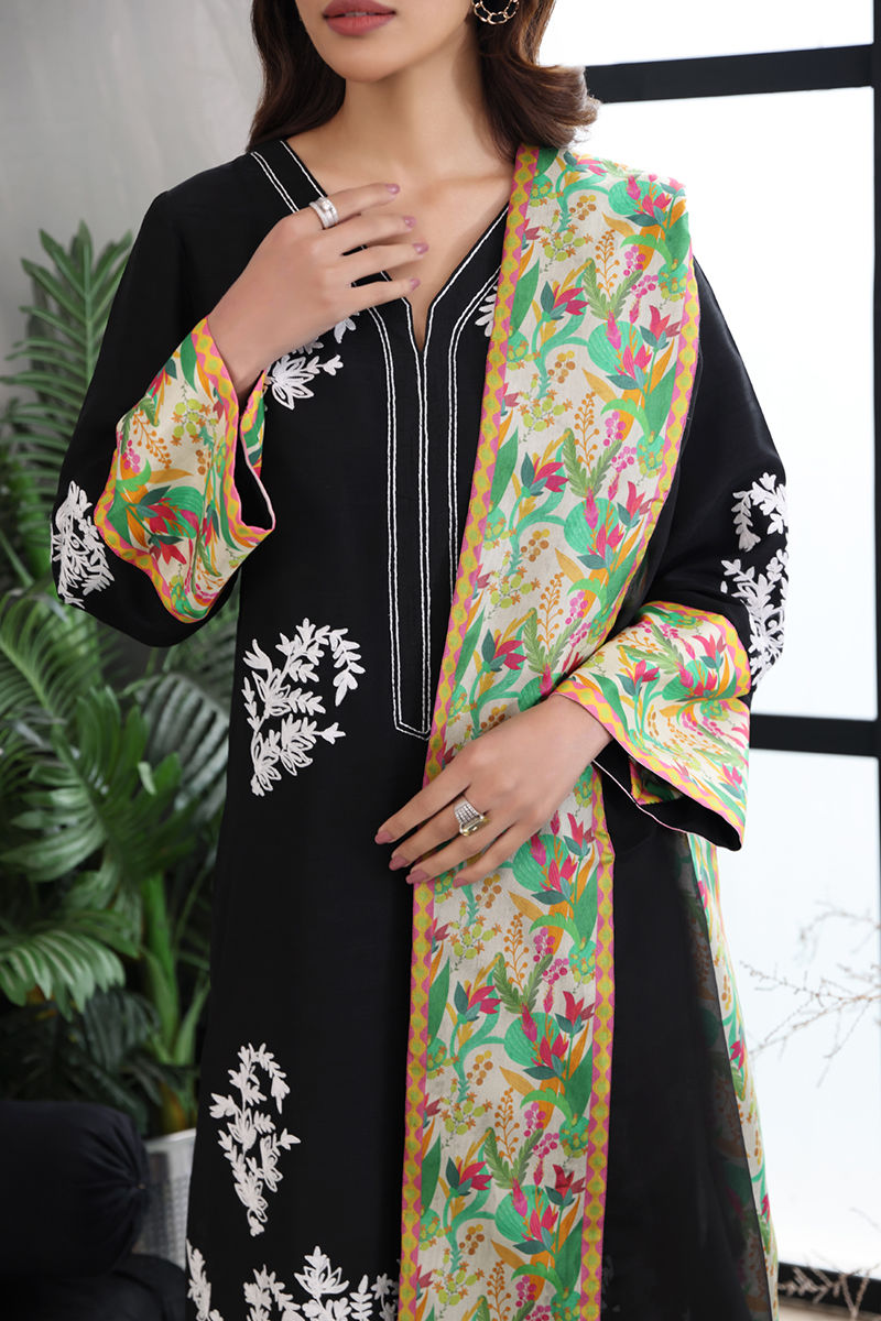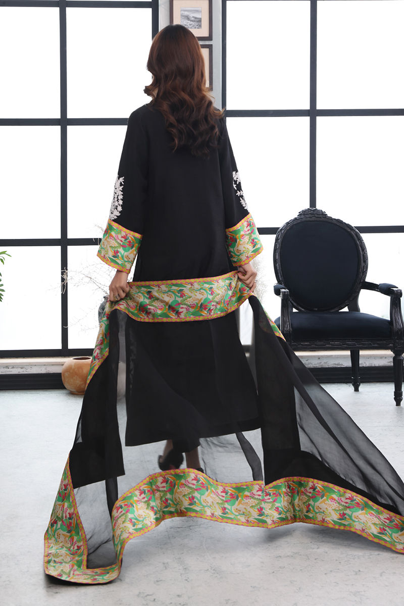 Step into sophistication with this black shirt adorned with intricate white aari embroidery, gracing both the shirt and sleeves. The sleeves further captivate with a digital border finish, adding a modern flair to the ensemble. Paired seamlessly with plain black pants, the outfit exudes timeless elegance. Elevate the look with an organza dupatta featuring a delicate digital print border all around, providing a perfect balance of tradition and contemporary style. The length of the shirt is 49 inches.