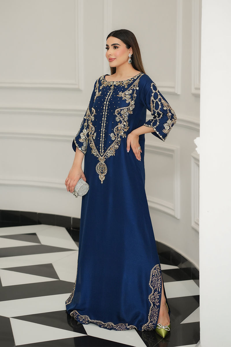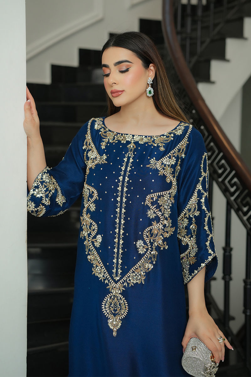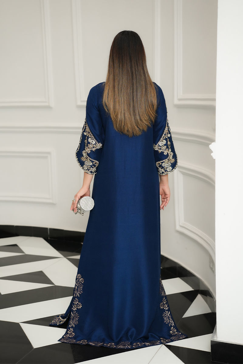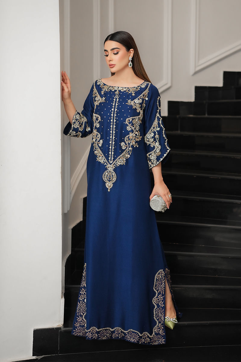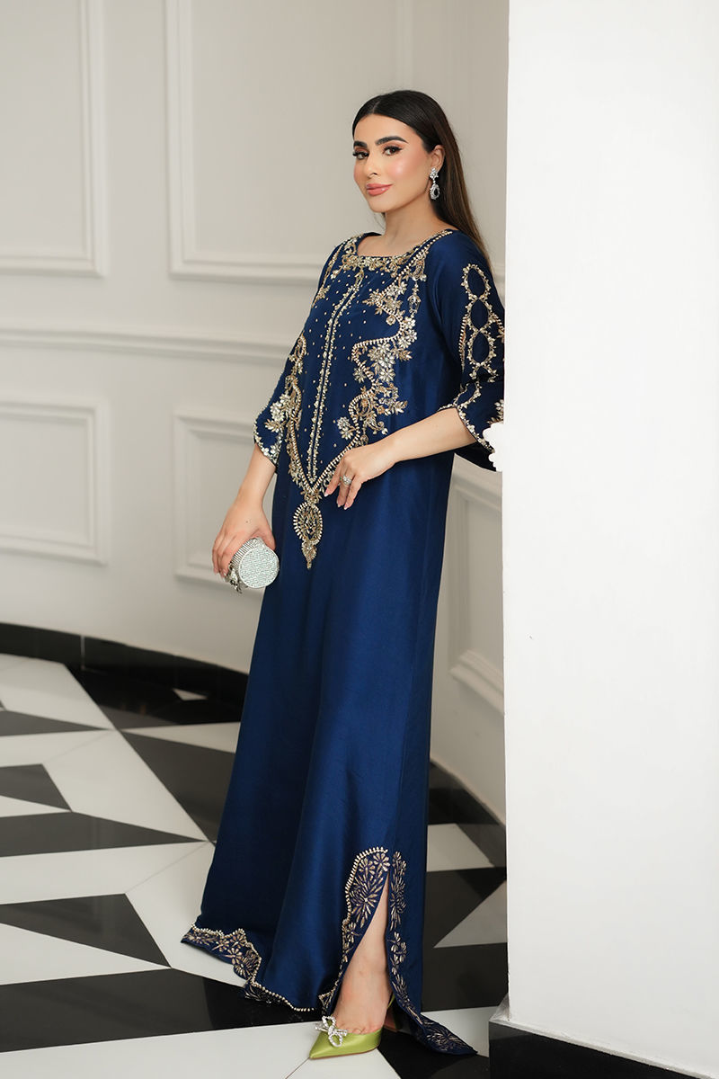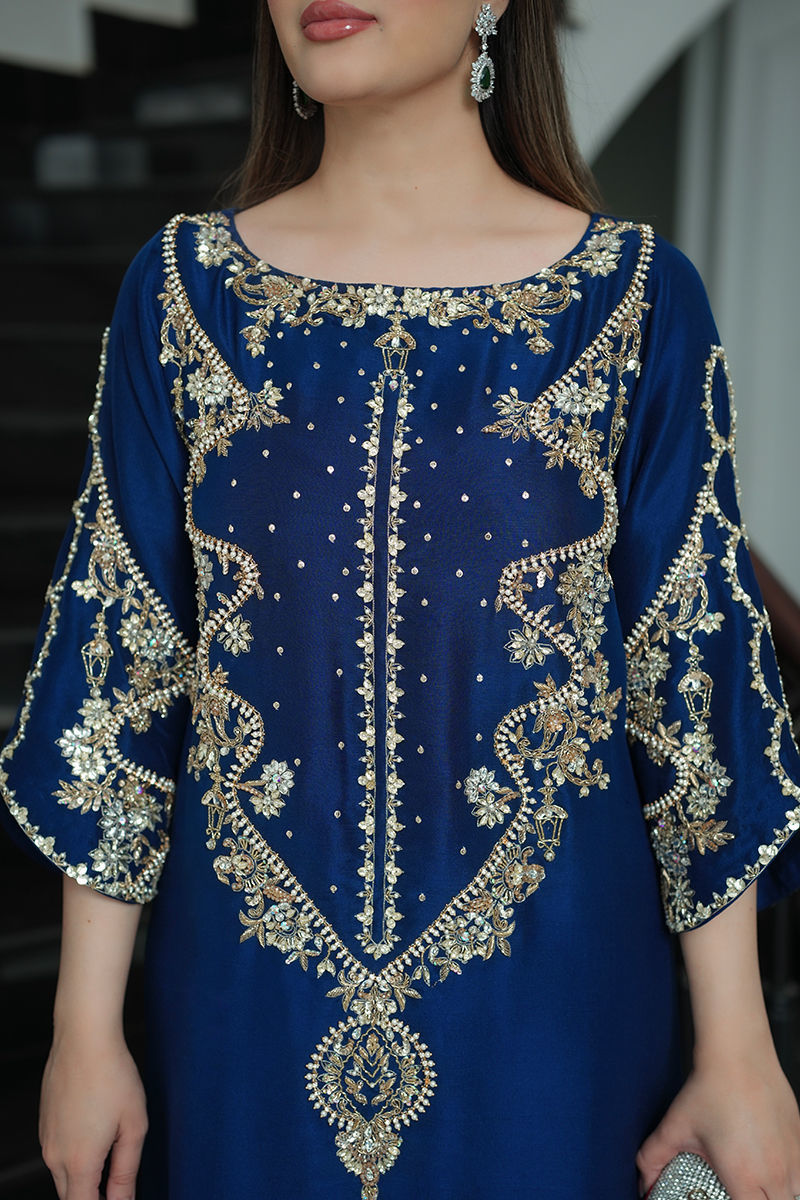A striking vision in blue, this pure raw silk kaftan is adorned with a symphony of pearls, Swarovski, sequins, nakshi, and gold and silver cut daana, with zevar moti delicately tracing the neckline, daman, and slit. The daman glows with tilla work and pearls, creating an opulent finish. Paired with sleek pants, this flowing silhouette exudes effortless grace, blending regal grandeur with timeless romance.