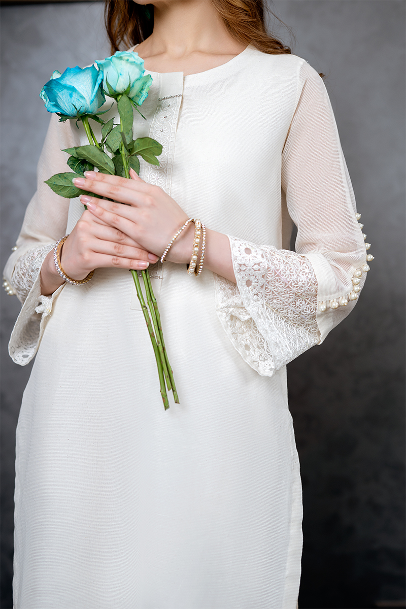 Be a vision of grace in the soft off-white dress. The embroidered neckline and sequin embellished sleeves are just perfect for any day time event. Pair it with organza dupatta for perfect everlasting majestic look