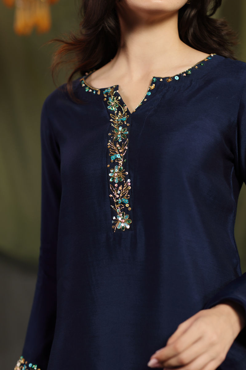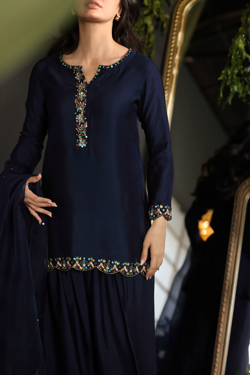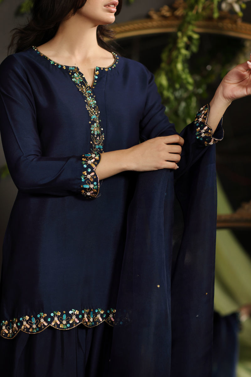Color: Dark Blue Fabric: Khaadi silk and Organza Work Details: Hand Embellished Cut Daana & Hand Embellished Sequins