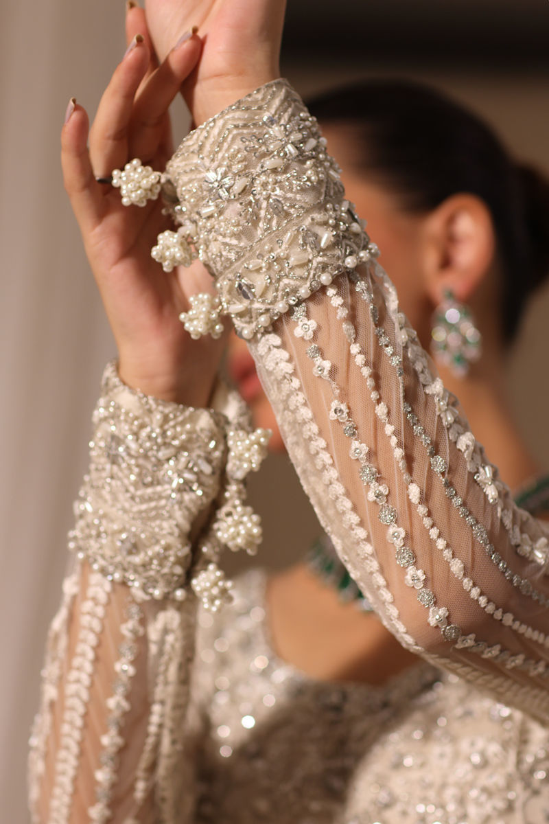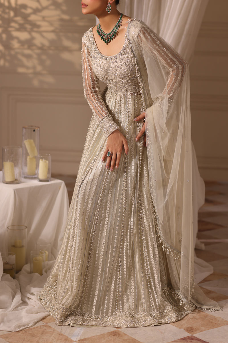 Immerse yourself in timeless elegance with our exquisite ivory net embroidered pishwas adorned with delicate hand-embellished pearl droplets, Swarovski crystals, cutdana, and intricate embroidery, featuring a heavily embellished daman and panels. Paired with a tissue Lehenga and a net dupatta decorated with chan, finished with lace, this ensemble exudes timeless elegance.