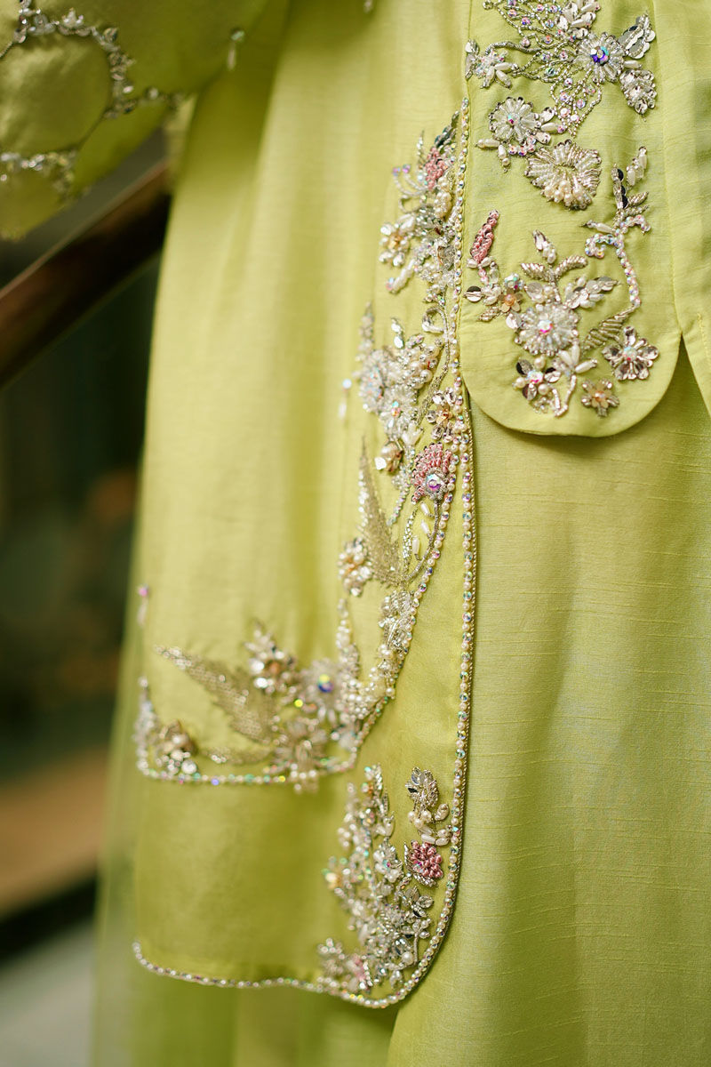 Simrah - a symphony of pearls and resham knots on soothing lime green silk. With its flowing farshi shalwar and ruffled net dupatta, it embodies timeless grace touched with modern romance, it’s pure understated elegance.
