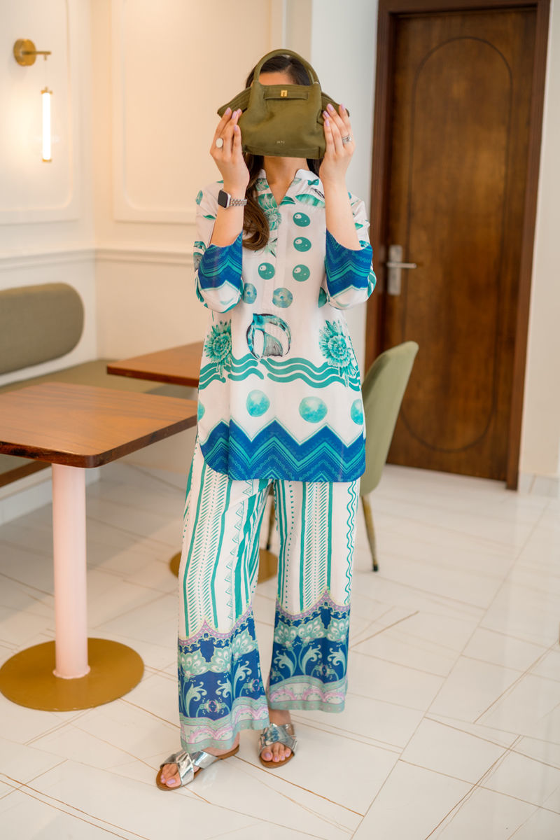 A two-piece ensemble crafted from silk, featuring a digitally printed shirt and culotte pants. The shirt is delicately hand-embellished with beads along the front, adding a refined touch of sparkle. The silhouette merges effortless style with elevated detailing.