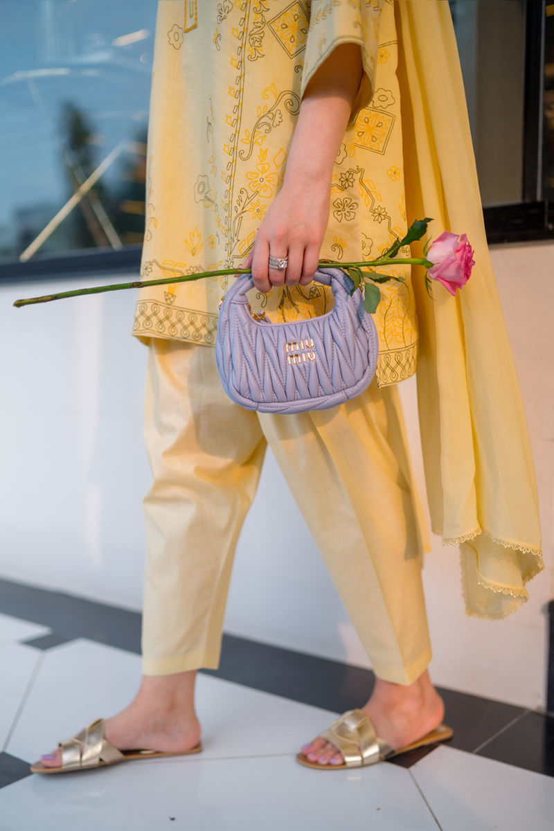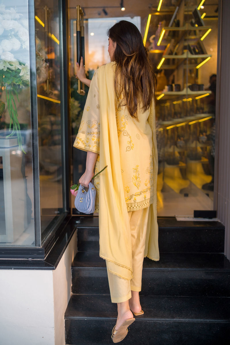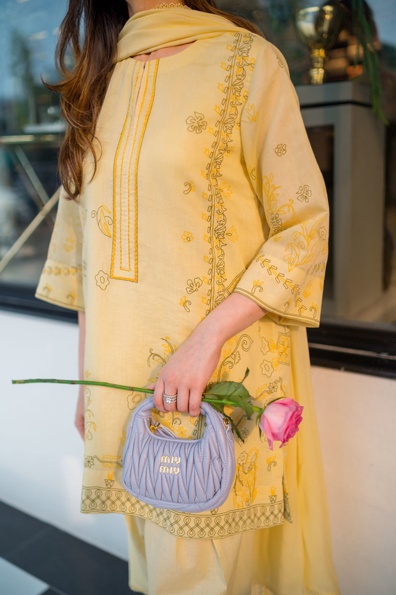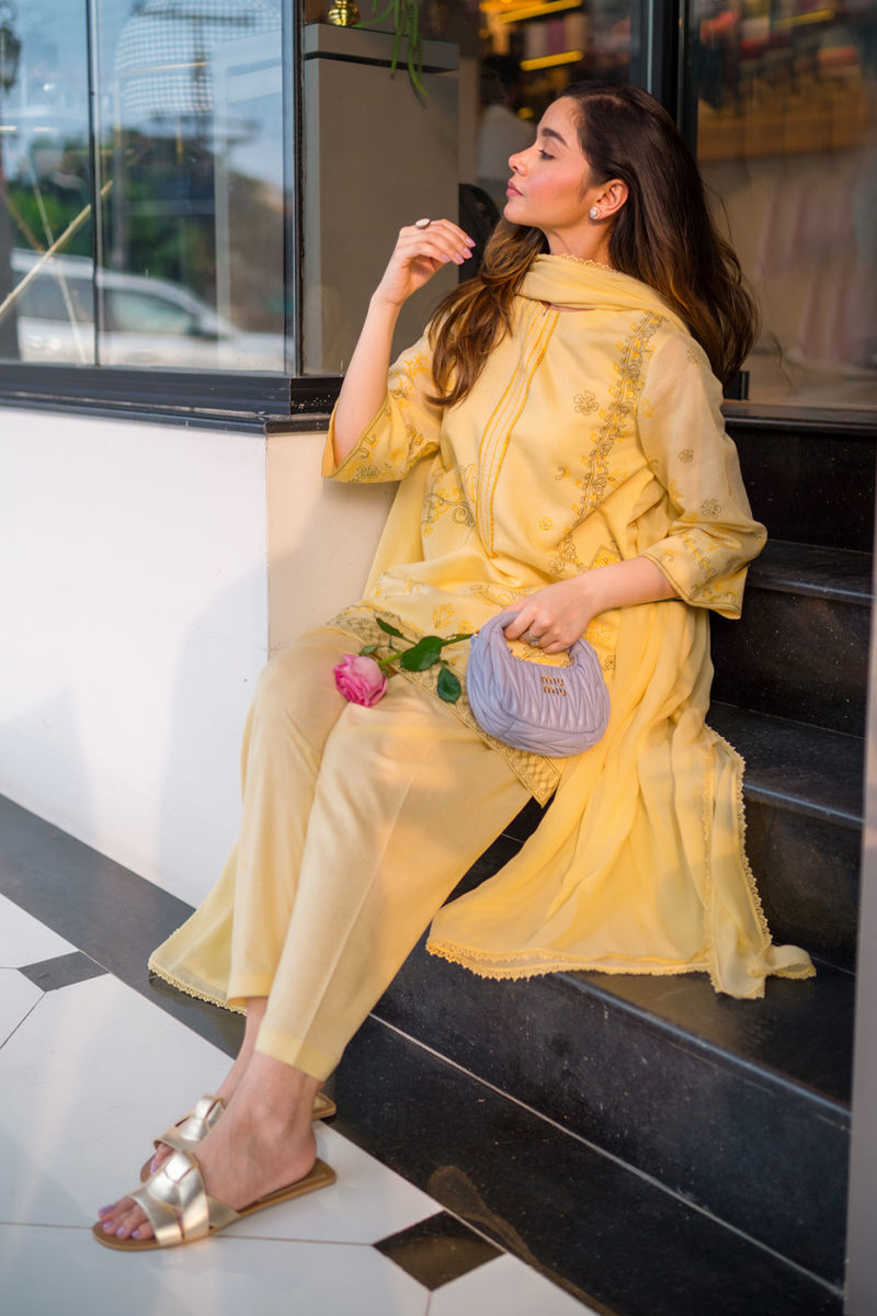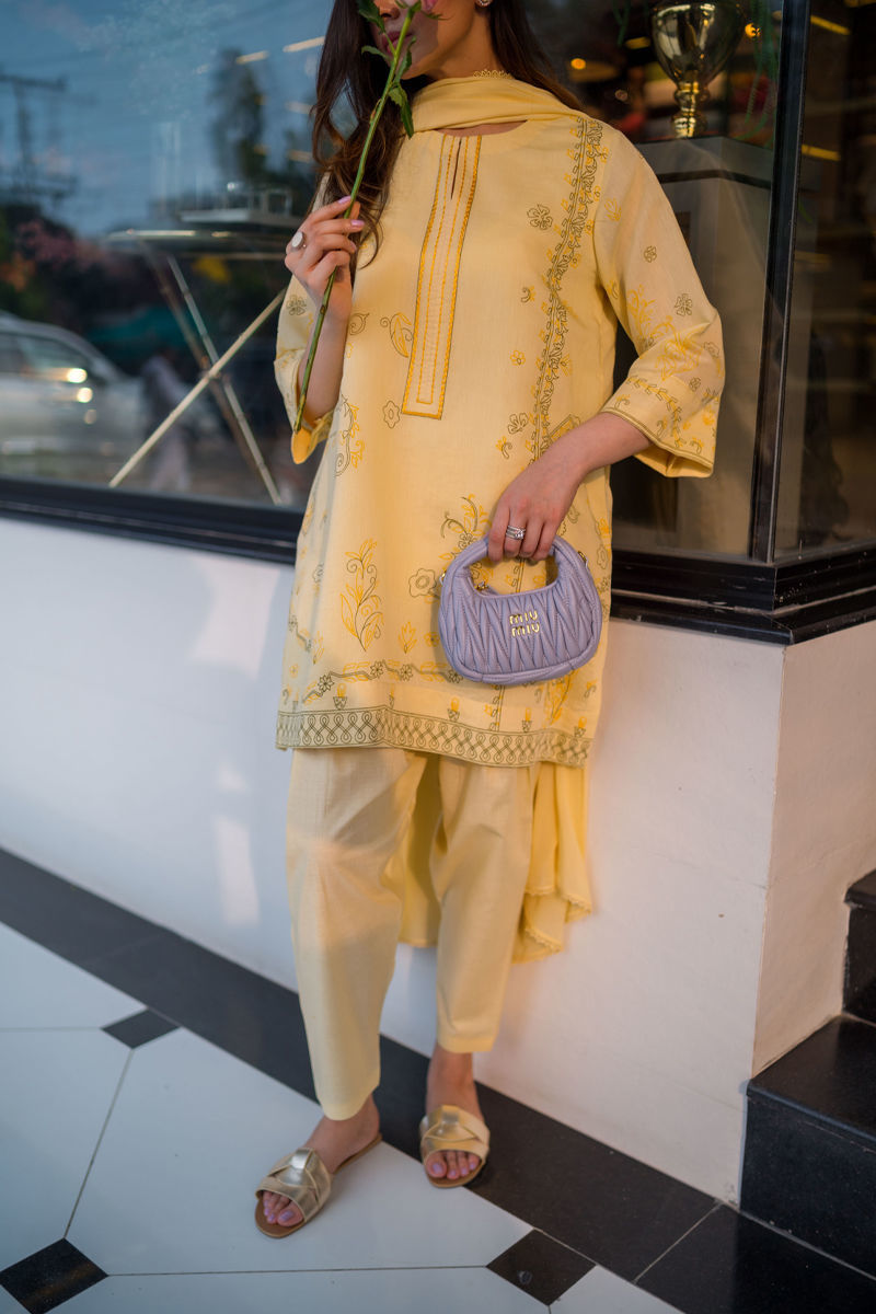 A breezy pure cotton silk shirt with delicate screen print and subtle embroidery along the neckline, radiating effortless charm. Paired with a sleek cotton skinny shalwar and a chiffon dupatta kissed with lace. A soft, romantic look made for sunlit moments. It's an a-line cut with loose hips.