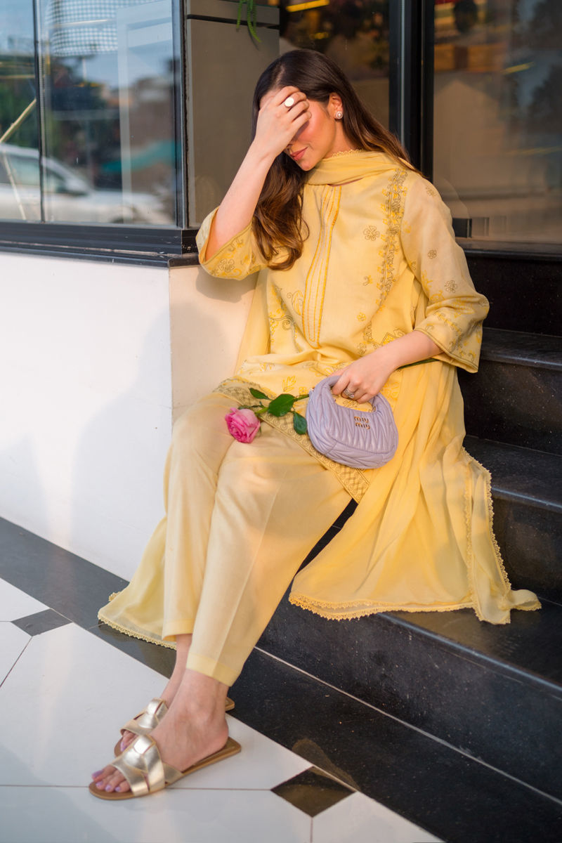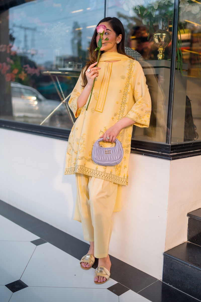 A breezy pure cotton silk shirt with delicate screen print and subtle embroidery along the neckline, radiating effortless charm. Paired with a sleek cotton skinny shalwar and a chiffon dupatta kissed with lace. A soft, romantic look made for sunlit moments. It's an a-line cut with loose hips.