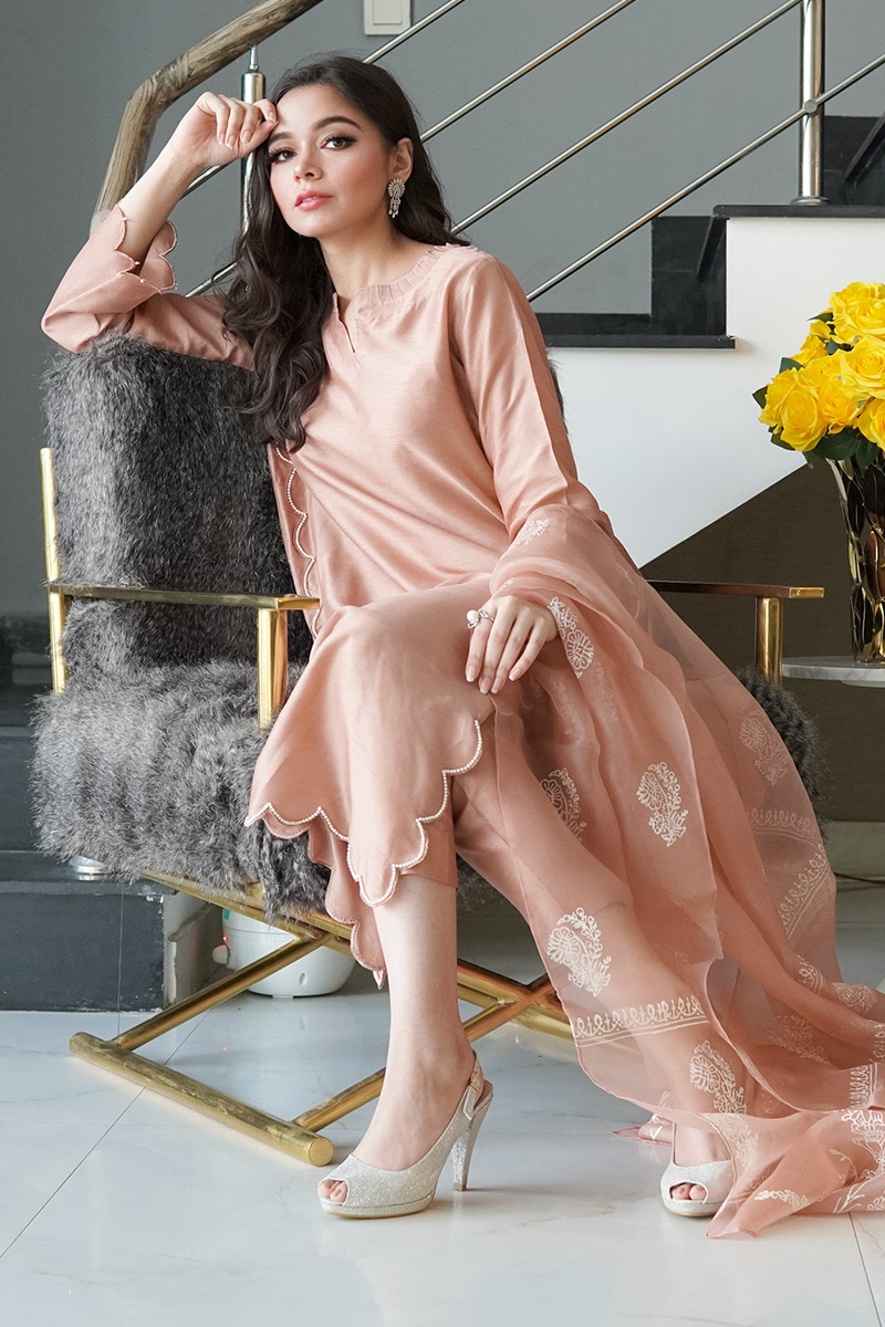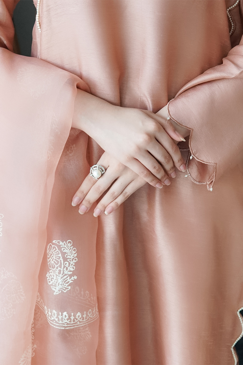 Our Korean raw silk tea pink shirt with pearl scallops on both sides and daman. It has scallop sleeve finish with pearl hangings and pleated neckline. It is paired with Screen printed organza dupatta and Plain korean raw silk pants.