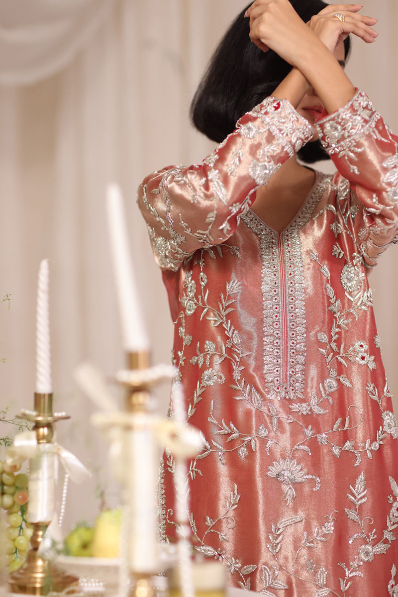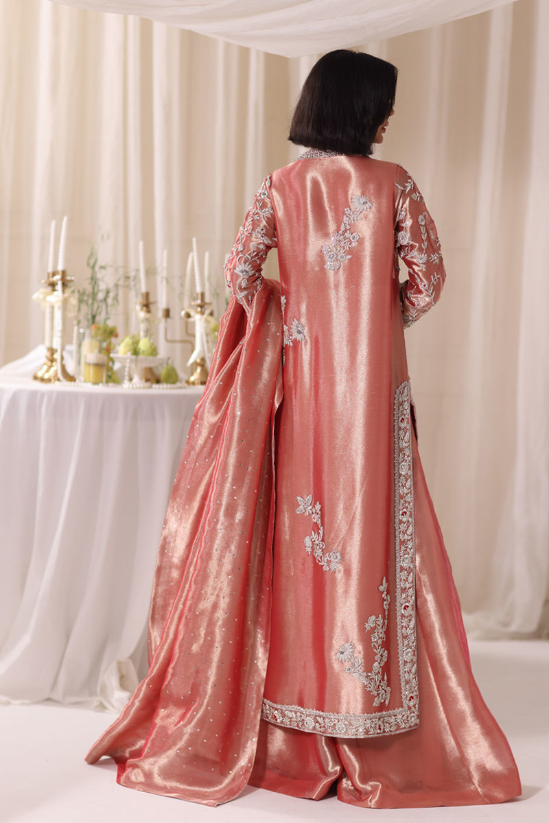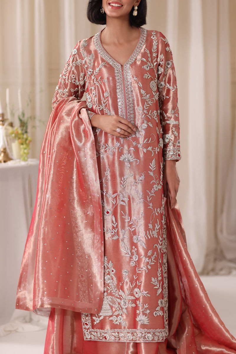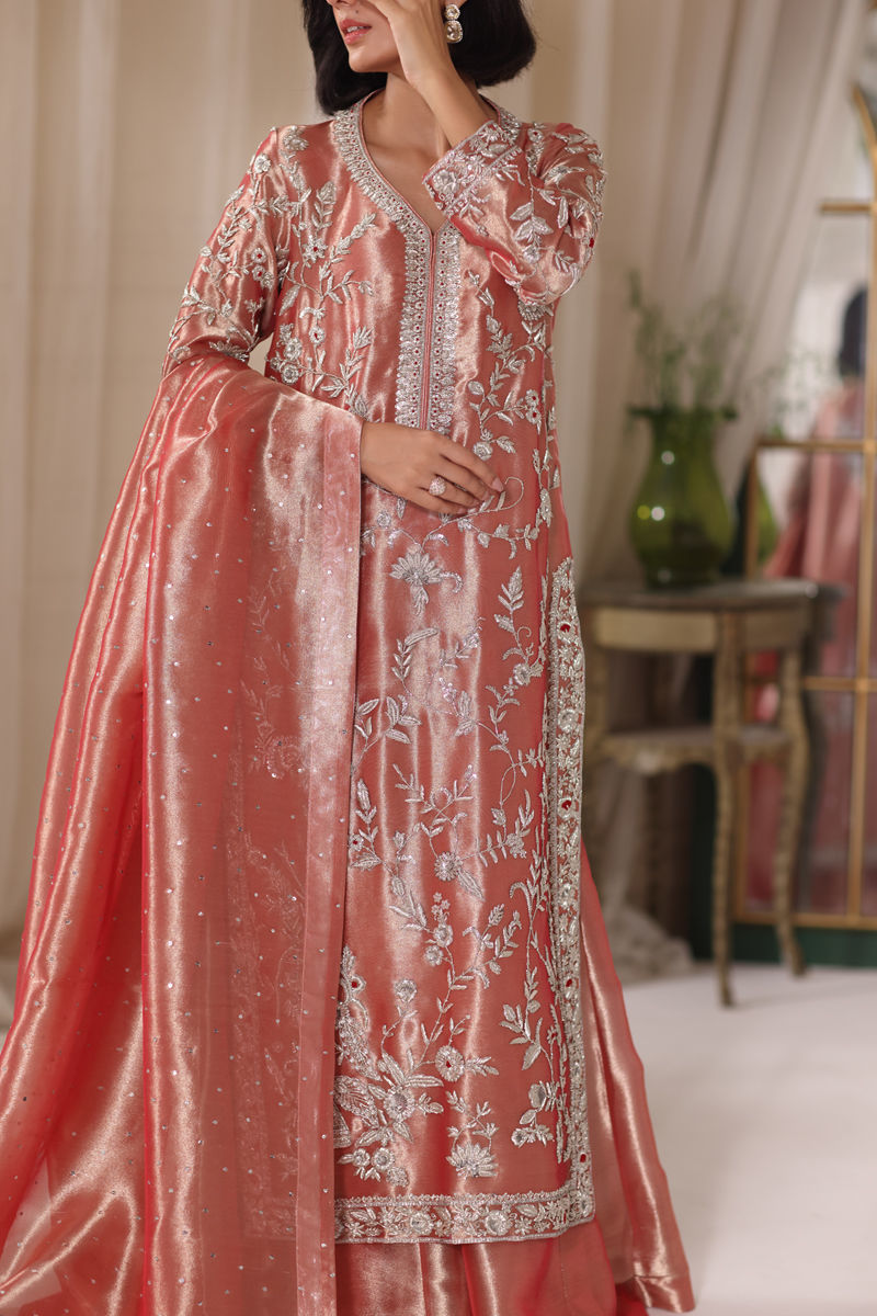 Bathed in a peachy red glow, this tissue shirt gleams with intricate silver nakshi and dabka work across the front and sleeves, while delicate resham graces its borders and cuffs. The ethereal tissue dupatta shimmers with hand-embellished sequins and a silver tissue finish, completing the look with soft brilliance. Paired with a voluminous tissue lehenga lined in silk, the ensemble is a breathtaking ode to timeless romance and regal elegance.