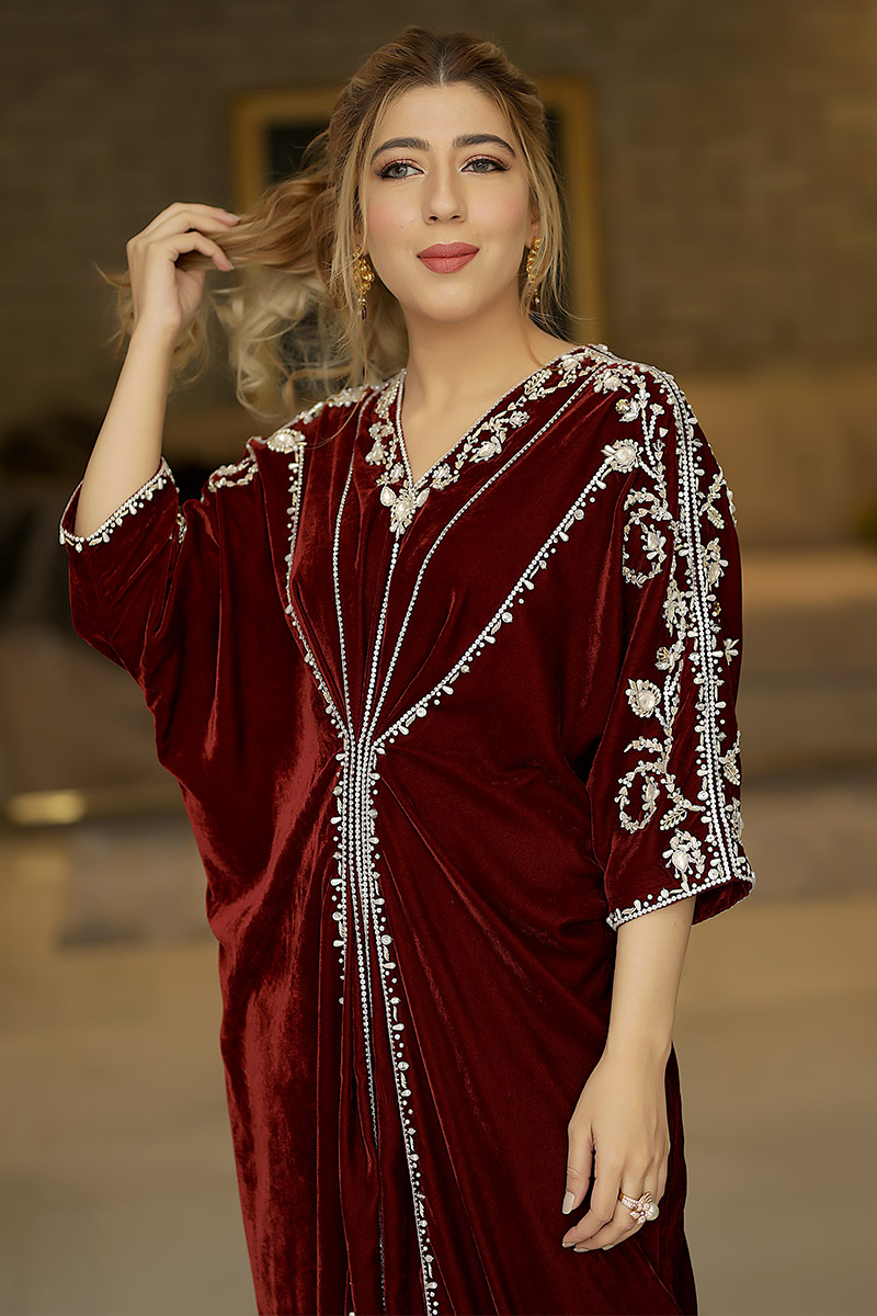 A must-have for your year-round festive wardrobe. An embellished maroon velvet kaftaan that can be worn day after day.