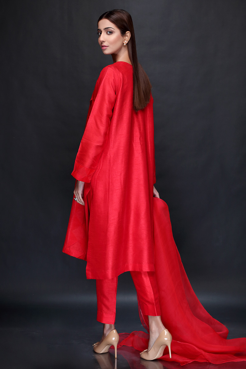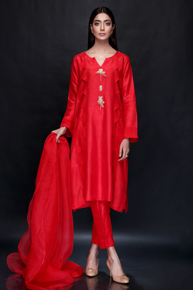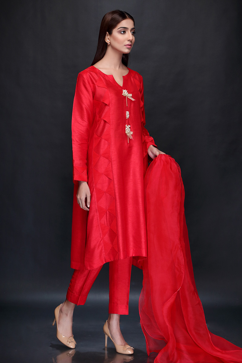 This Indian raw silk red shirt with stitched organza triangles and handcrafted pearls and ribbons is paired with pants and organza dupatta to complete the look.