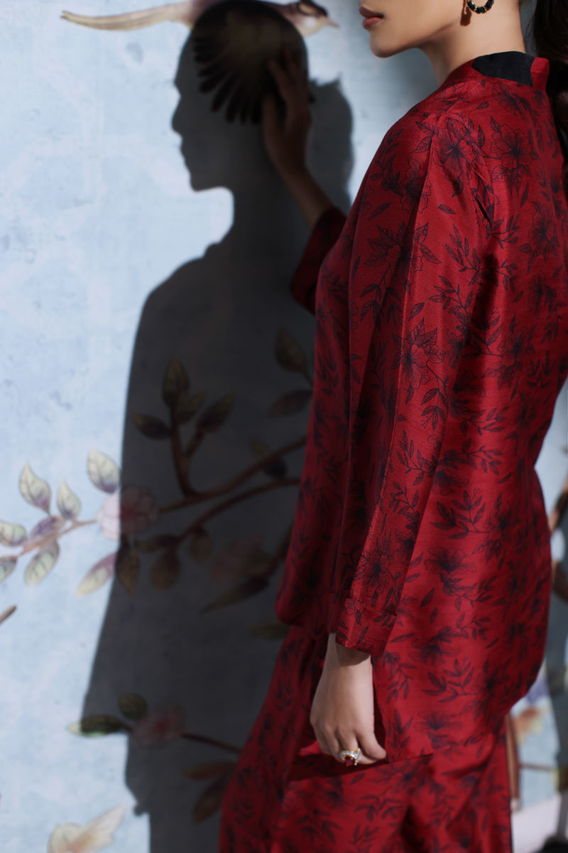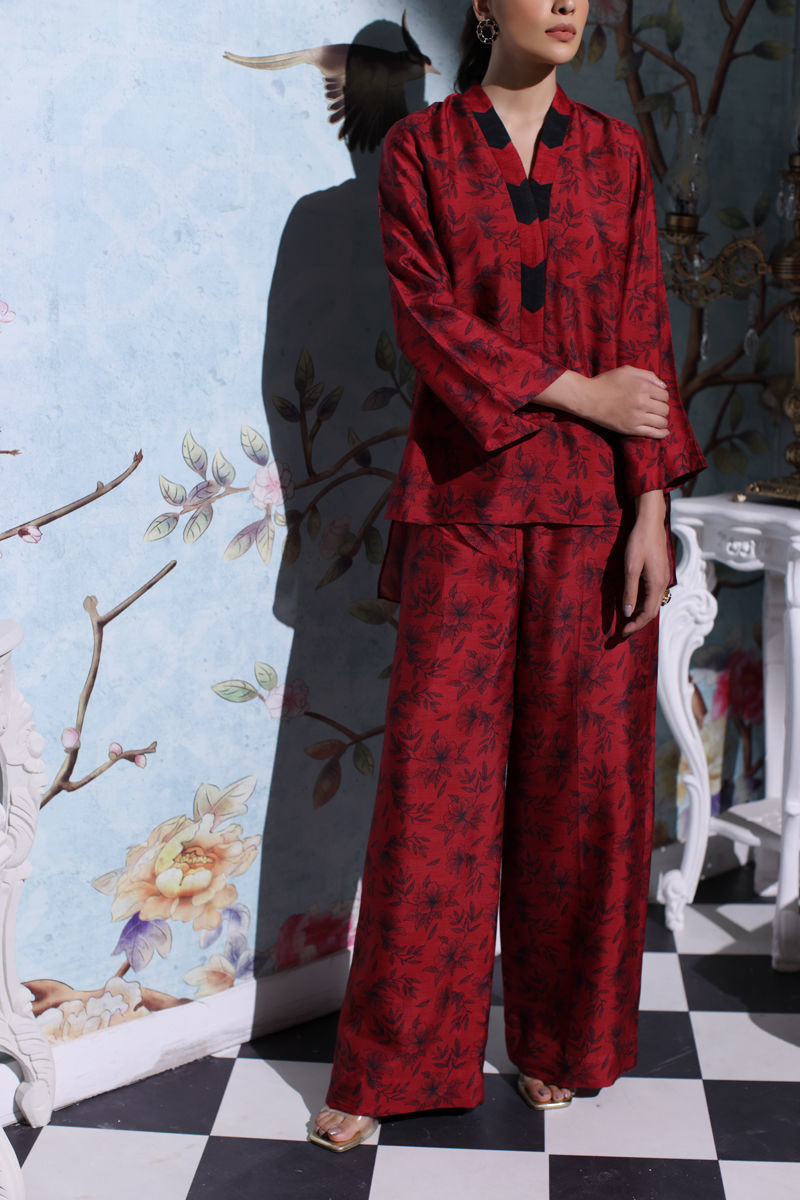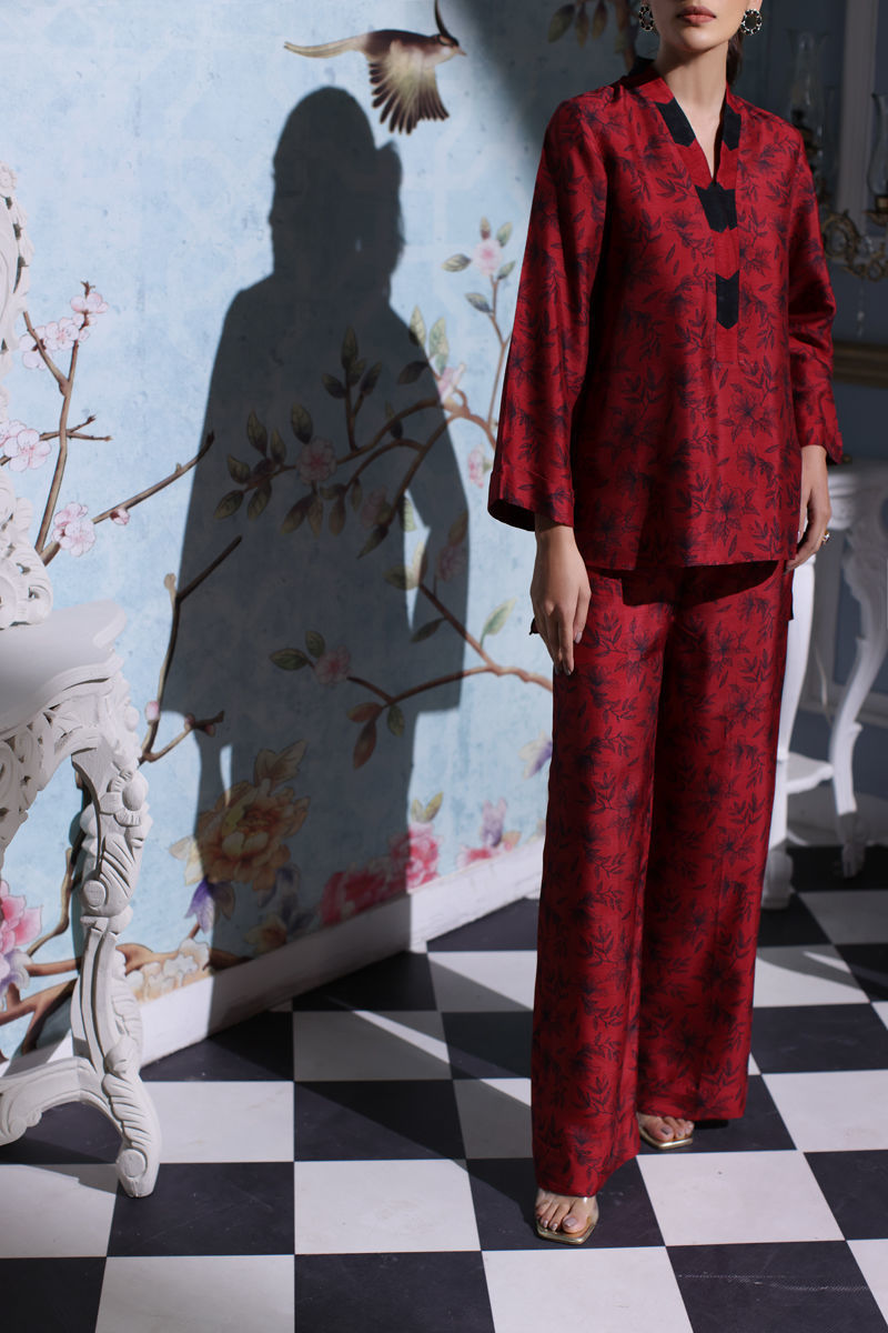 A symphony of silk and digital finesse, where style meets sophistication. Elegance unfolds in a canvas for digital artistry in maroon and black on korean raw silk. The shirt boasts an intricate neckline, complemented by culotte pants.
