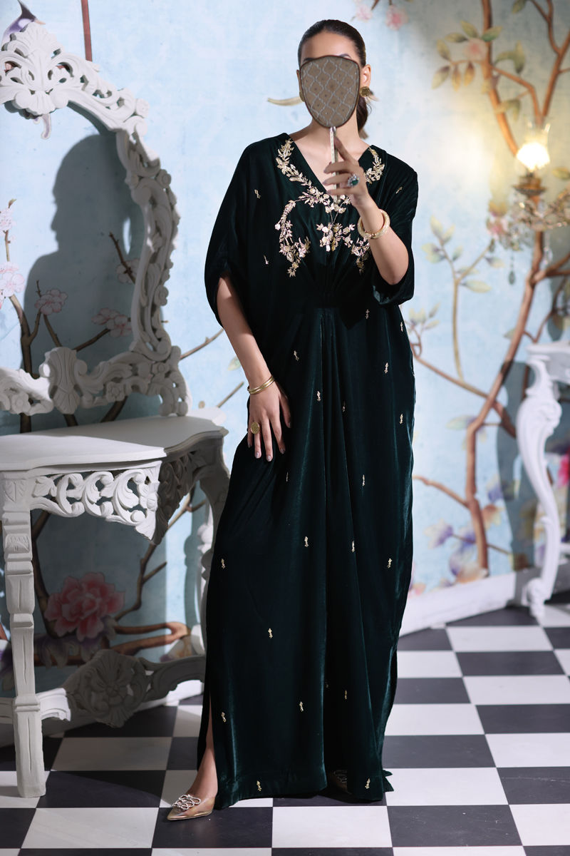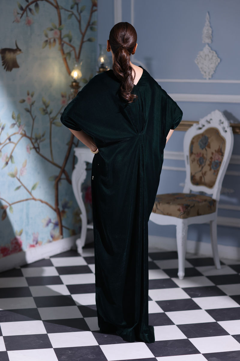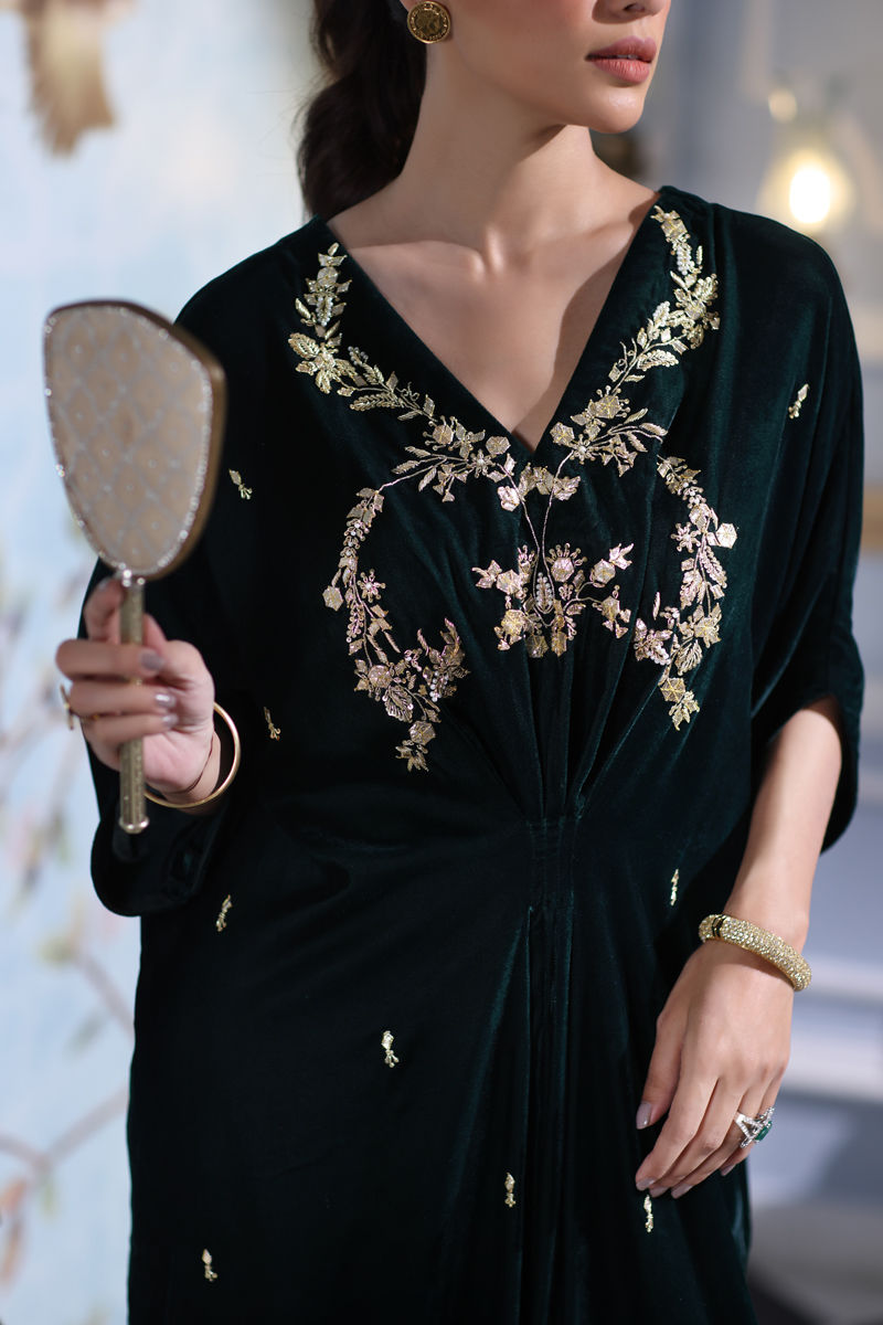 A lush green and gold combination, this outfit showcases a stunning green velvet kaftan adorned with exquisite gota and dabka work on the front. The entire kaftan is accentuated with a shimmering gota chan, making it a striking and regal choice for special occasions.