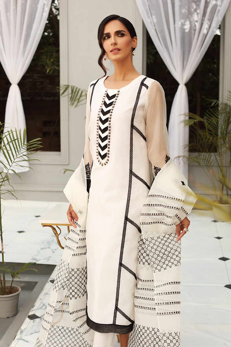 This meticulously worked pearl embellished shirt is our modern take on the classic black and white outfit. With geometric panel lacework detailing and sequin work embedded on organza, this shirt is a season must have. Finish your look with a complimenting block print dupatta and pants.