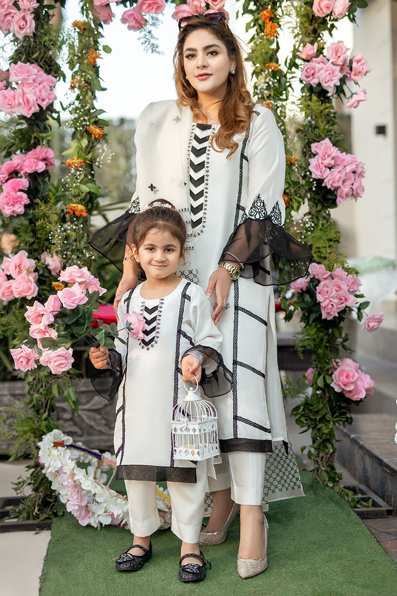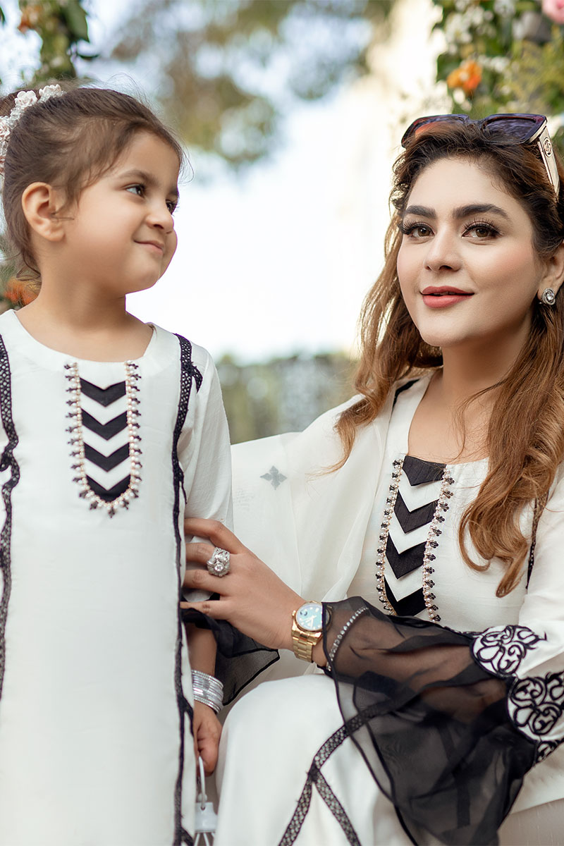Silk shirt with contrasting lace ,pearls chain embellishments and organza finish on sleeves is a must have this season. A perfect daytime look for any festive for you and your little rockstar