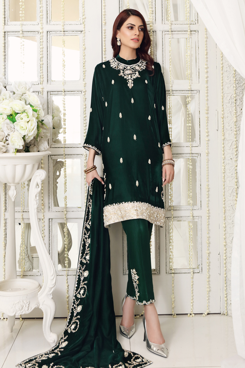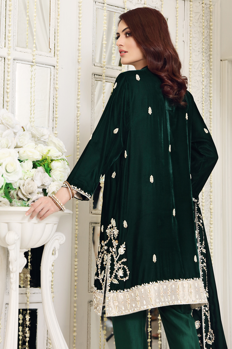 Color: Green Fabric: Velvet Work Details: Pearls and stones