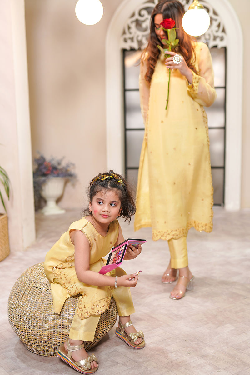 The yellow scallop’s shirt is made of organza and features intricate sitara detailing on the sides. It has a high collar neckline with sequins finish, adding a touch of sparkle and elegance. The sleeves are hand-embellished with sequins, providing intricate detailing and a beautiful finish. The smooth texture of the Korean silk adds a luxurious touch to the ensemble.