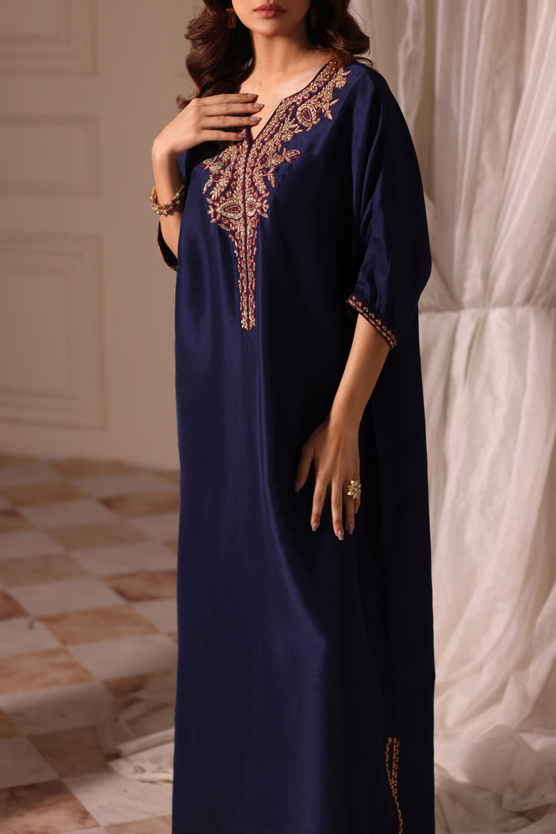 Elevate your wardrobe with this pure navy-blue raw silk kaftan features exquisite hand-embellishment in gold and maroon on the neckline, sleeves, and slit finishes. The back is adorned with intricate loops, showcasing the same rich embellishments, adding a touch of regality.