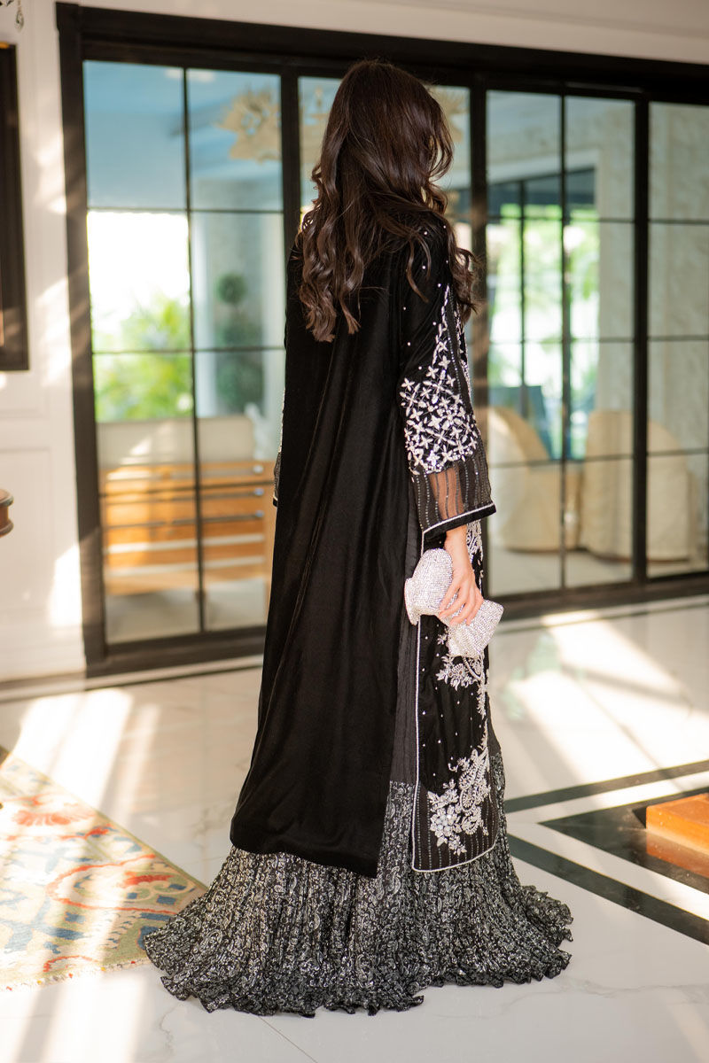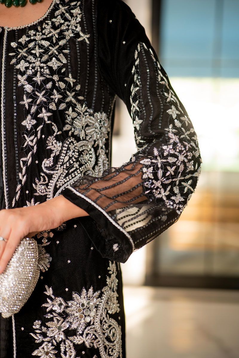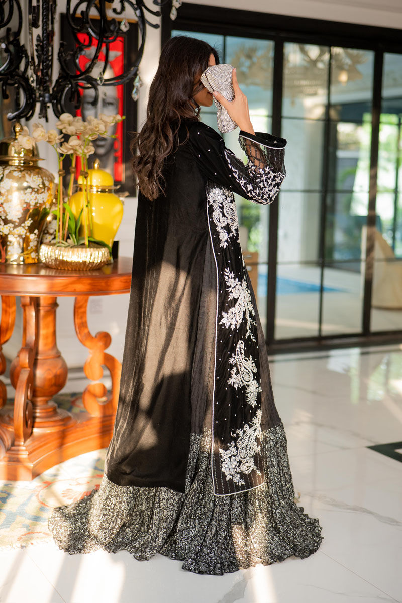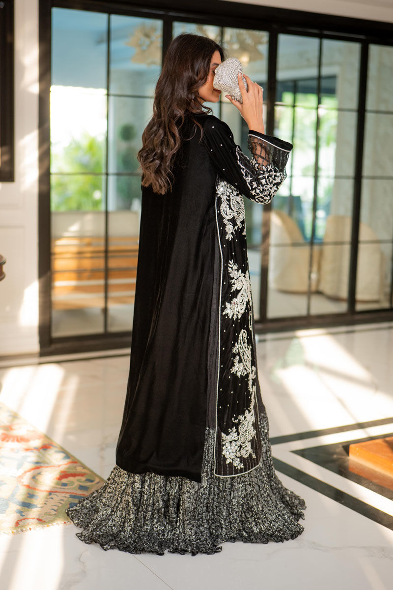 Color: Black Fabric: Velvet Work Details: Dabka, Mirror Work and Swavroski Crystals