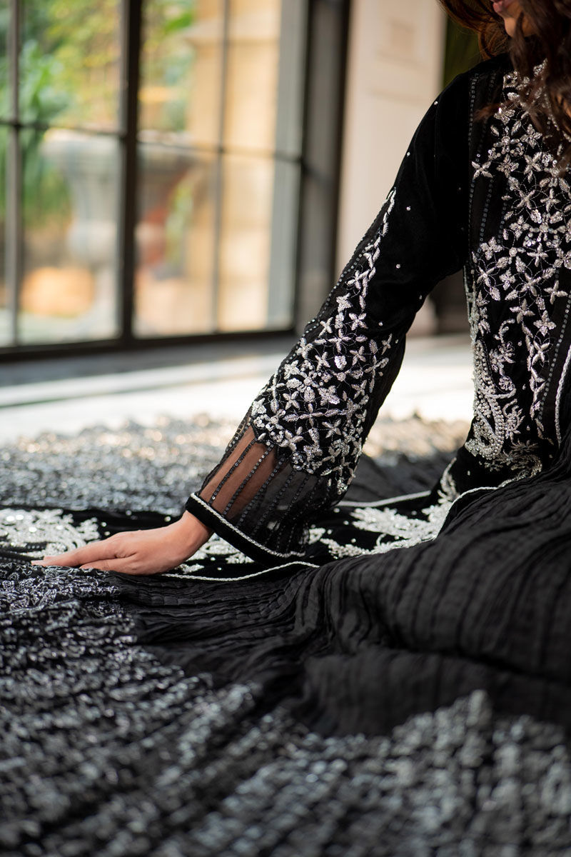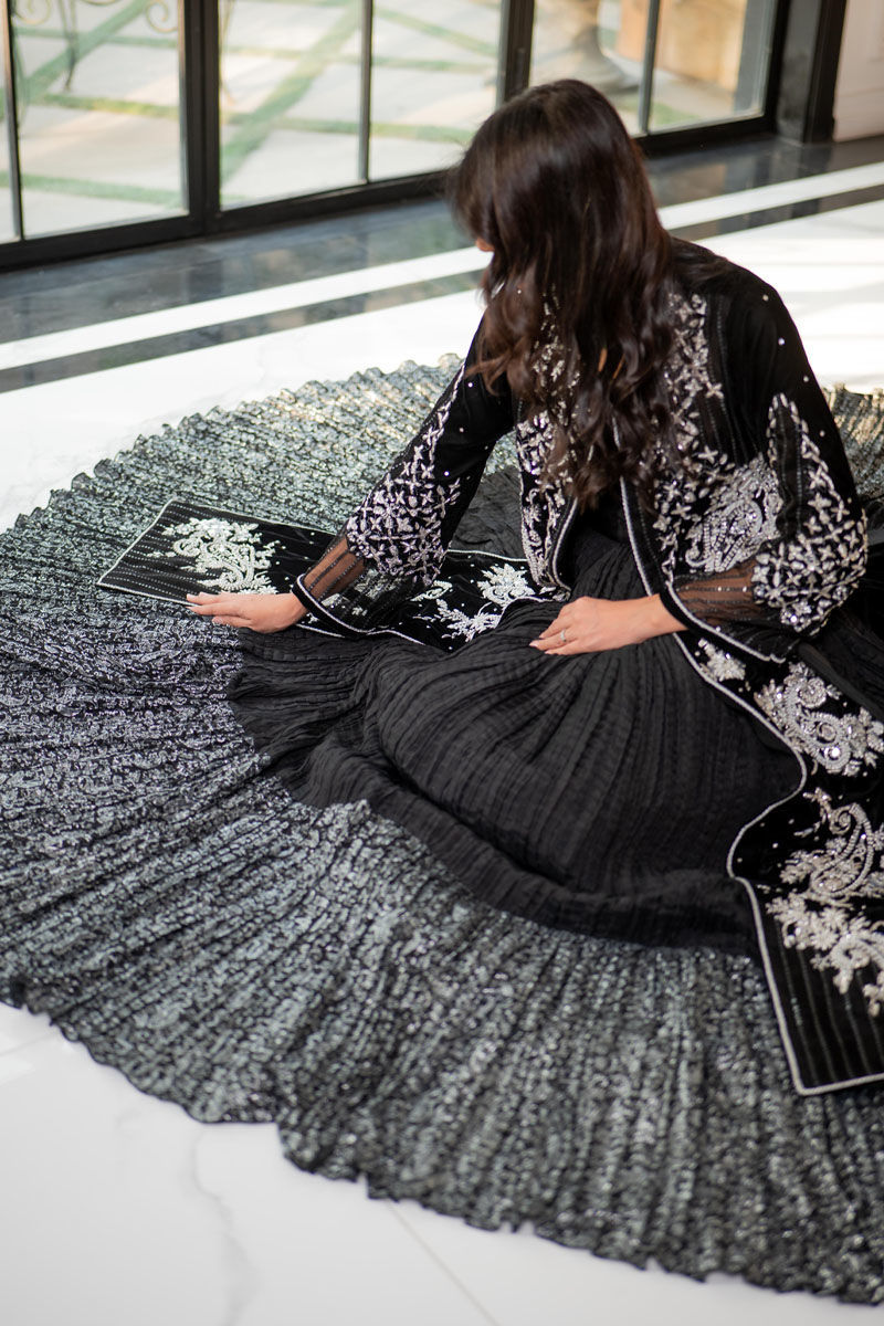 Zimil a symphony of black and silver, where timeless elegance meets opulent craft. The long velvet shirt shimmers with hand-embellished dabka, mirror work, and Swarovski crystals, paired with a silk crush lehnga kissed with silver screen prints. A look that captures the poetry of night in motion.