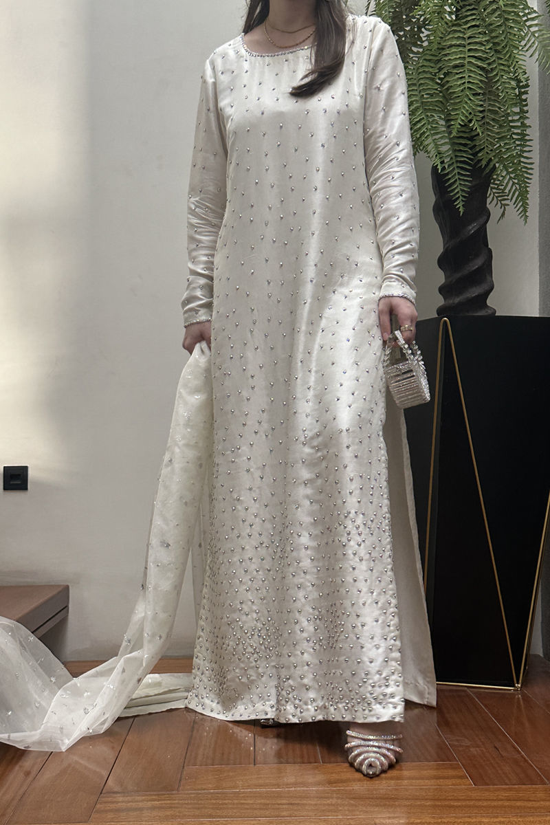 “Zuri” is an amalgamation of timeless silhouettes crafted to perfection, a ivory pure raw silk shirt laden with multi-colored Swarovski and silver sequins all over the shirt to give you an effortless but chic look. You can also pair it up with a self-jacquard dupatta.